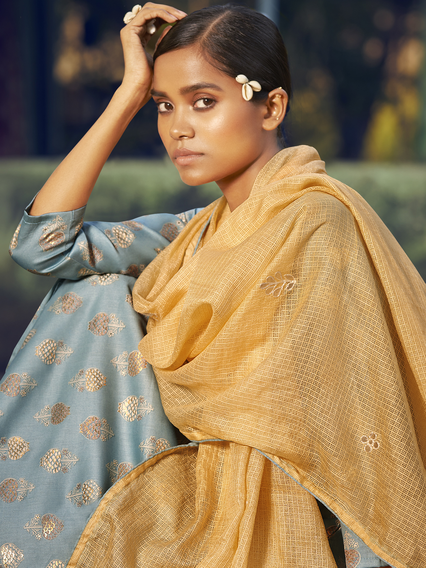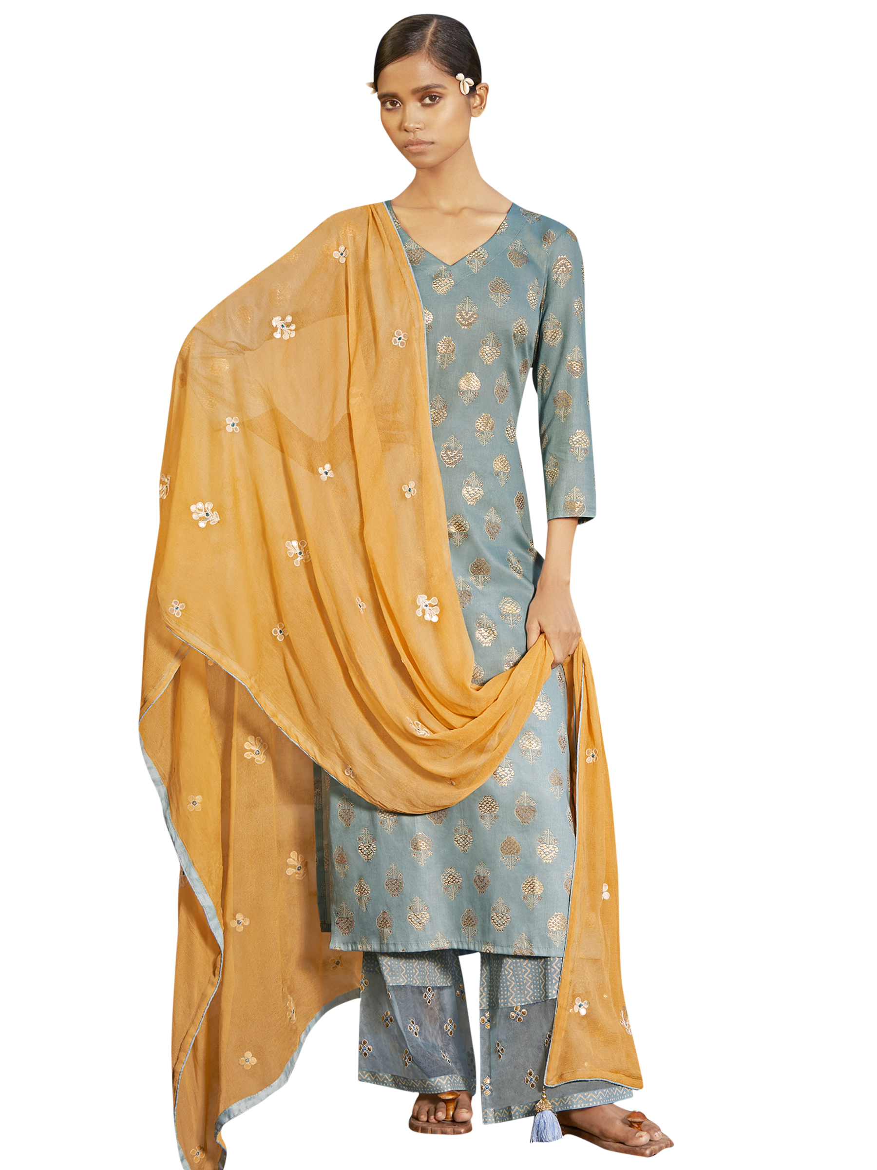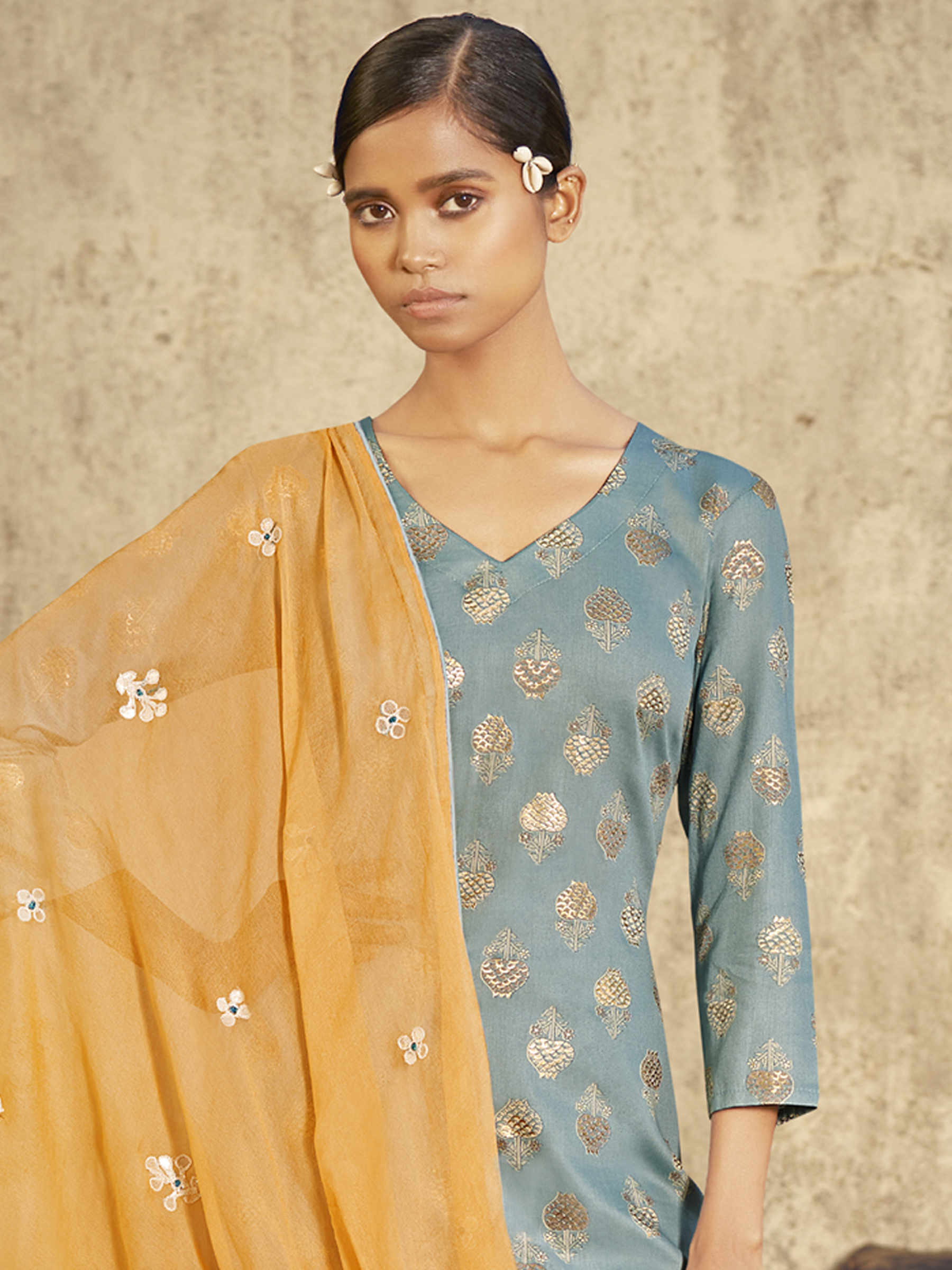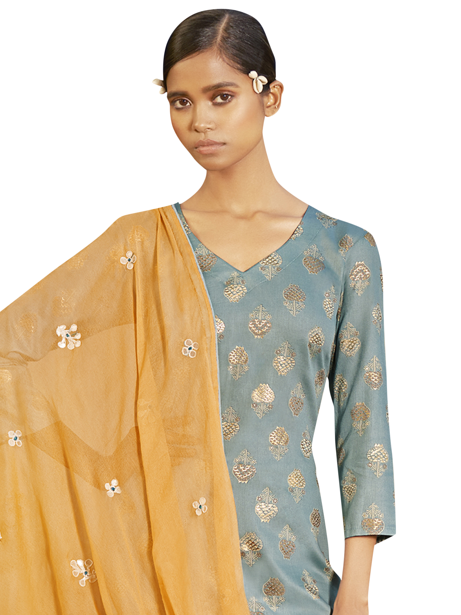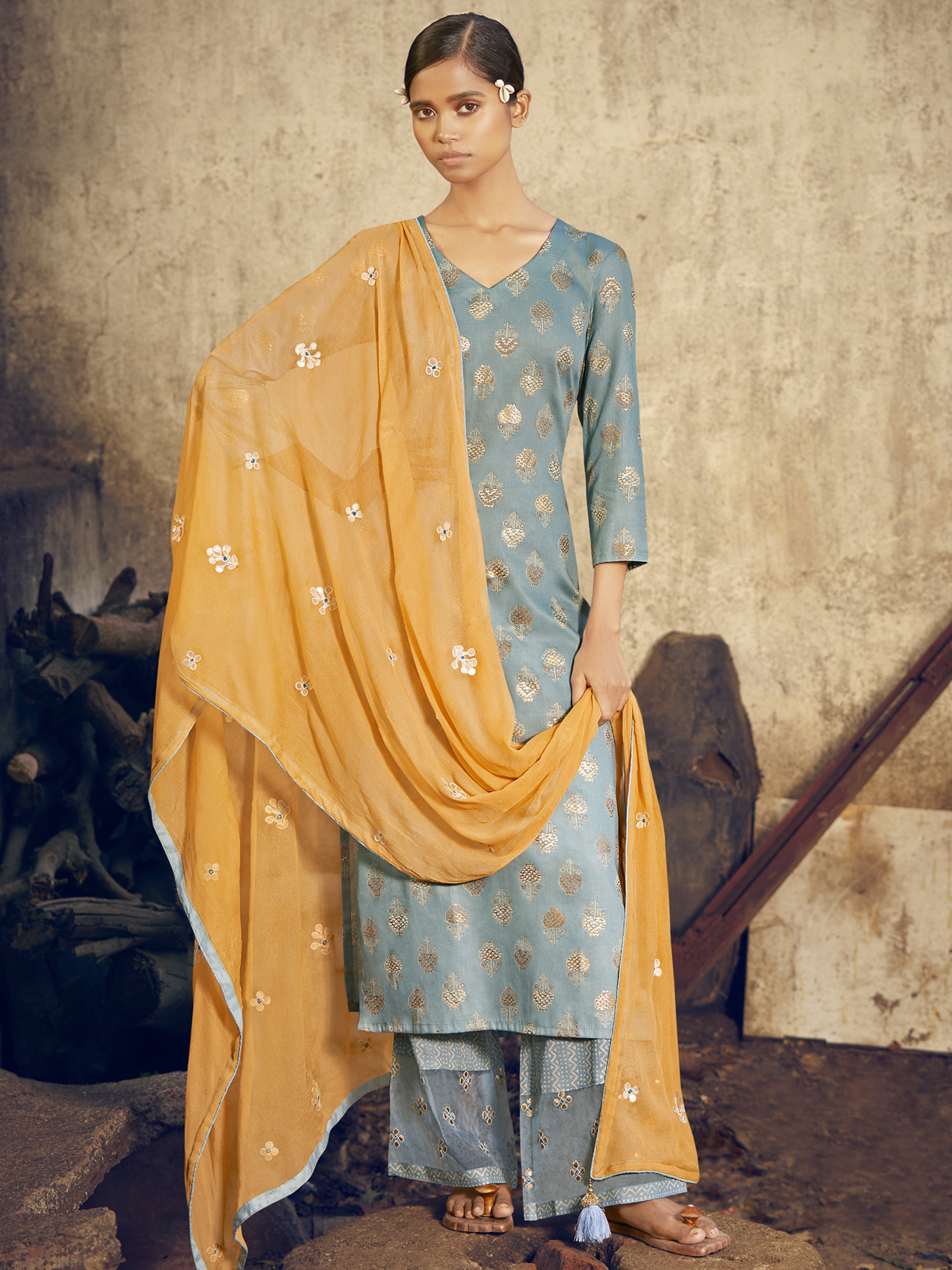 Top Colour:Sky Blue, Bottom colour:Sky Blue, Dupatta colour: Yellow