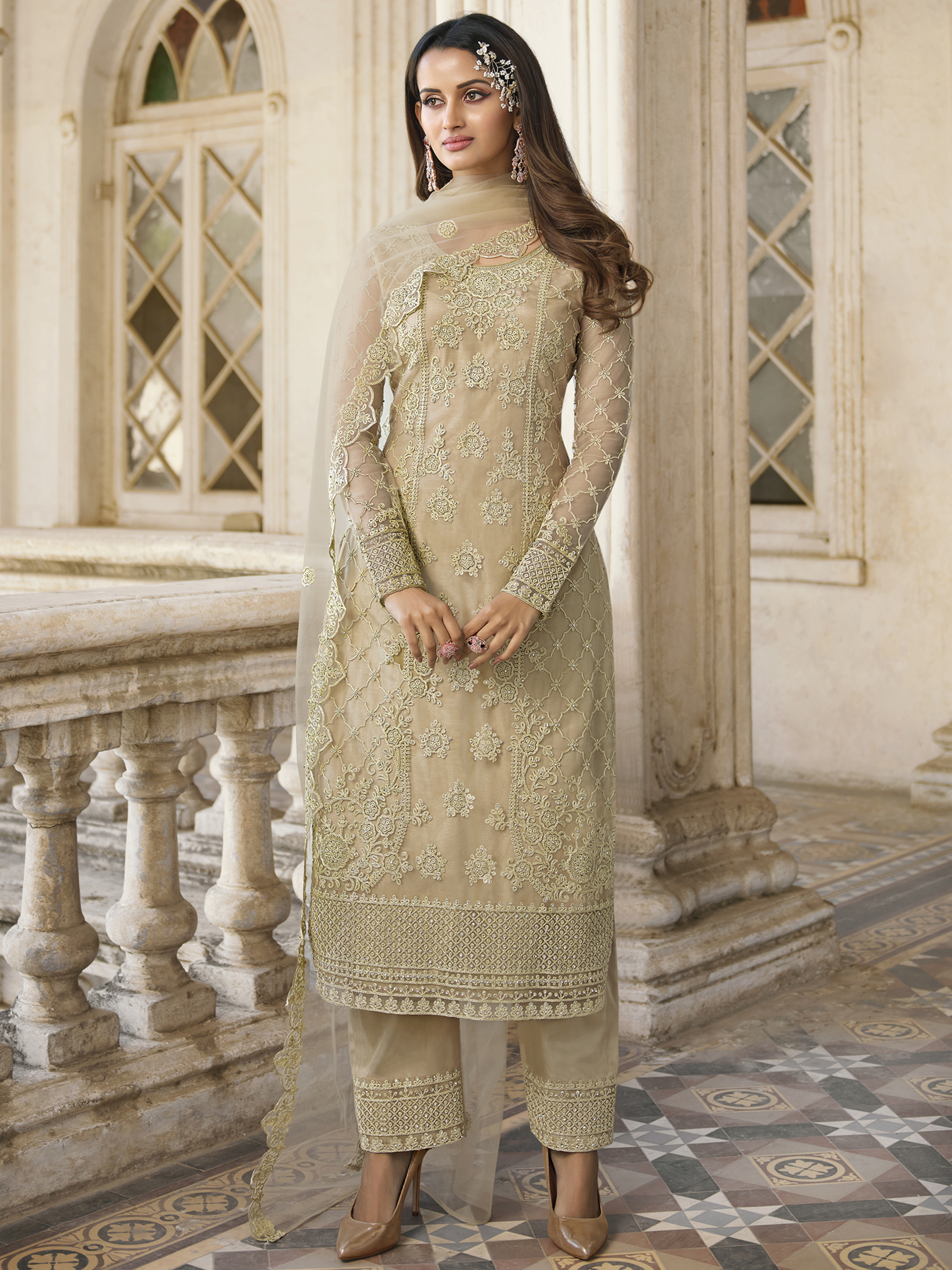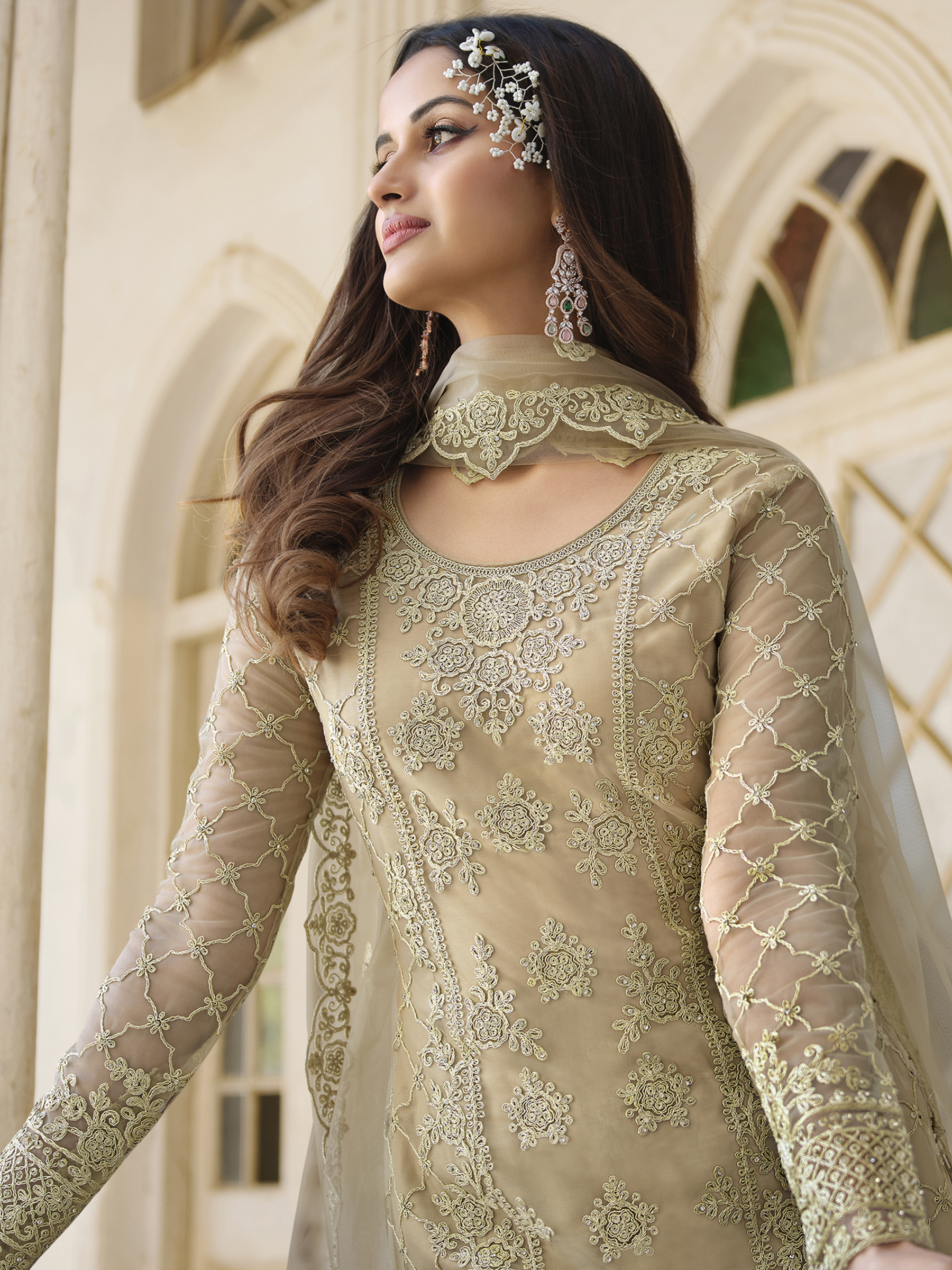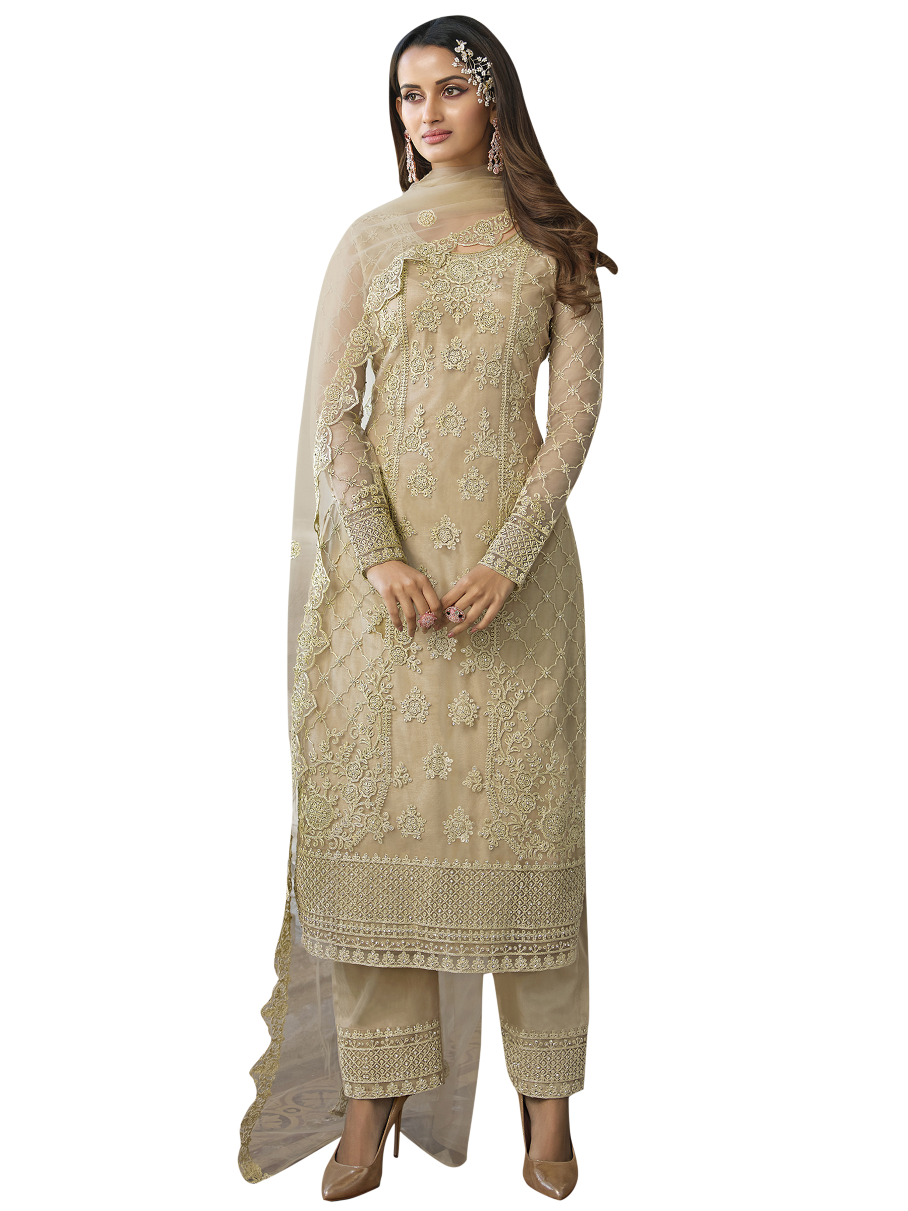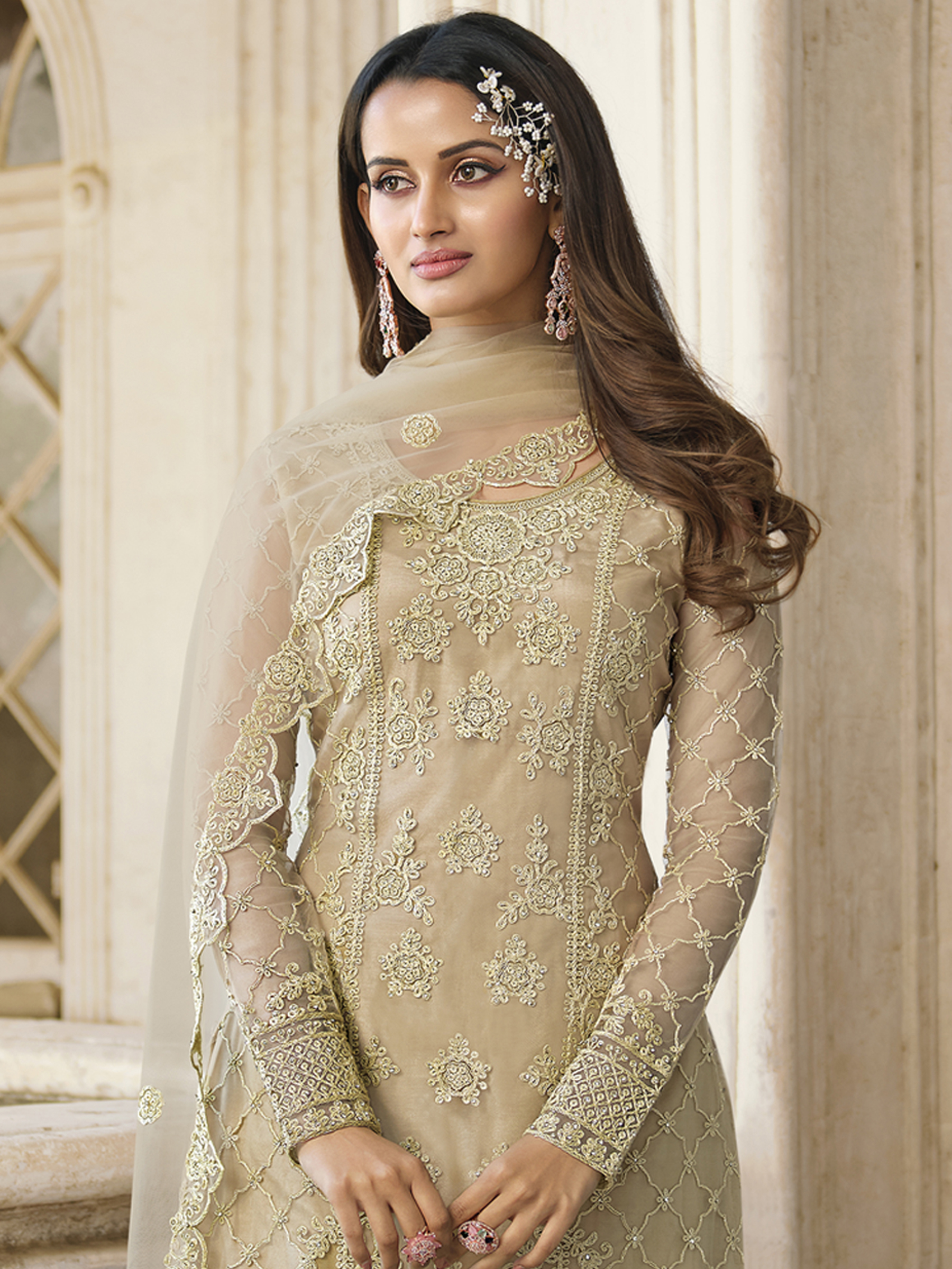 Top Colour:Beige, Bottom colour:Beige, Dupatta colour:Beige,Inner colour:Beige,