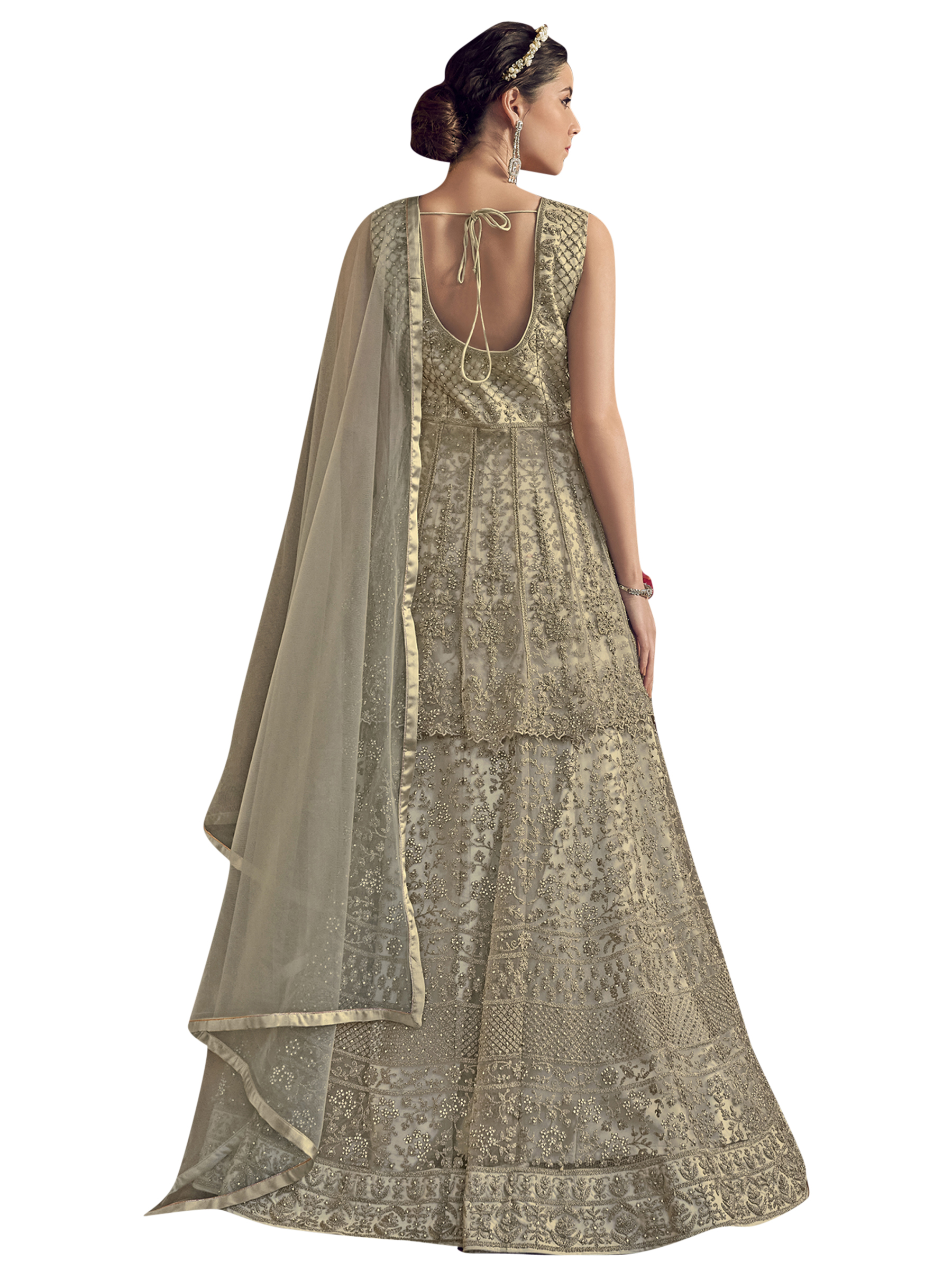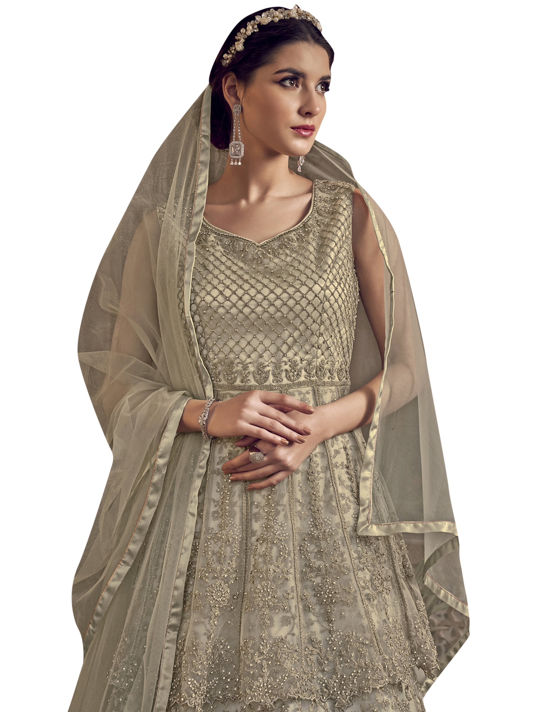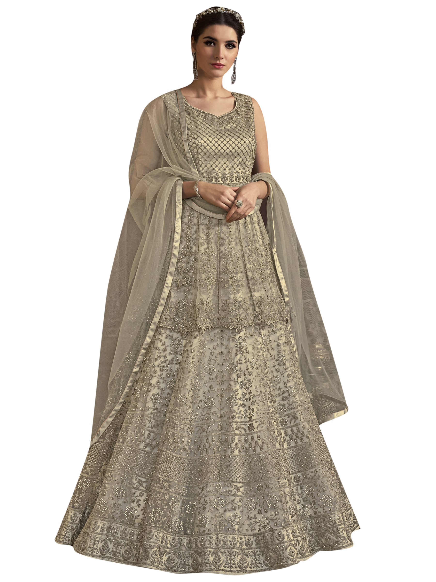 Stylee Lifestyle presents the all new collection of Embroidered Dress Material. Pair them with matching accessories to look trendy and gorgeous. Elegant Designer Cording Work With Crystal. DECLAIMER: The accessories on model are only for presentation purpose and not part of the product sold. The color of the product might slightly vary due to photoshoot effect or display brightness set-up. —————Full Product Details:- Colour Details: Top Colour: Cream, Bottom colour: Cream, Dupatta colour: Cream, Inner colour: Cream, Jacket colour: N/AFabric Details:- “Top Fabric:Net, Bottom Fabric: Satin, Dupatta Fabric: Net, Inner or Lining: Satin, Jacket Fabric:N/A, Size Details: Bust: 44″/Length: 58”, Bottom: 2.50 Mtr., Dupatta: 2.40 Mtr., Inner: AttachedOther Details:- Bottom Style: Churidar, Sleeve Type: Sleeveless, Neck Type: V Neck, Dress Style: Gown Style, Work: Embroidered