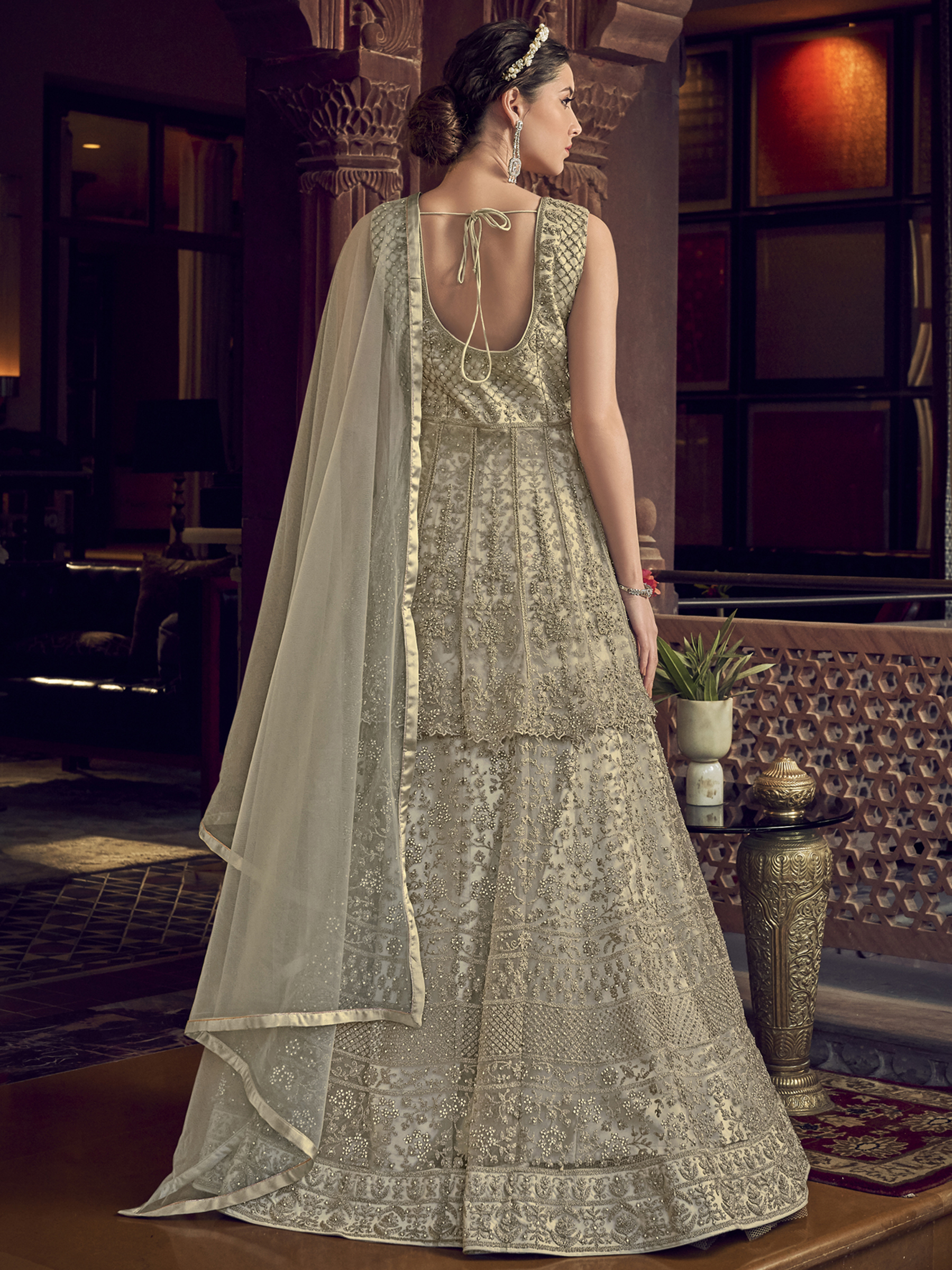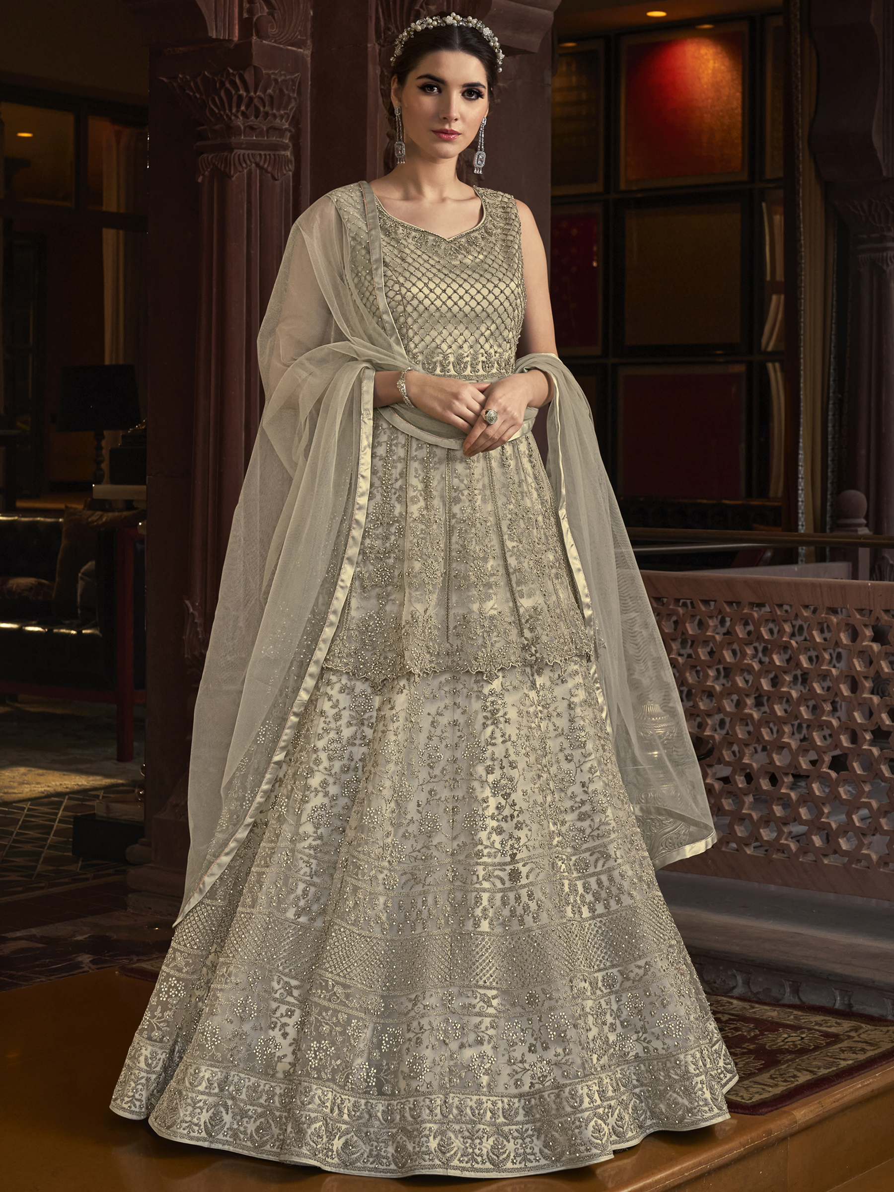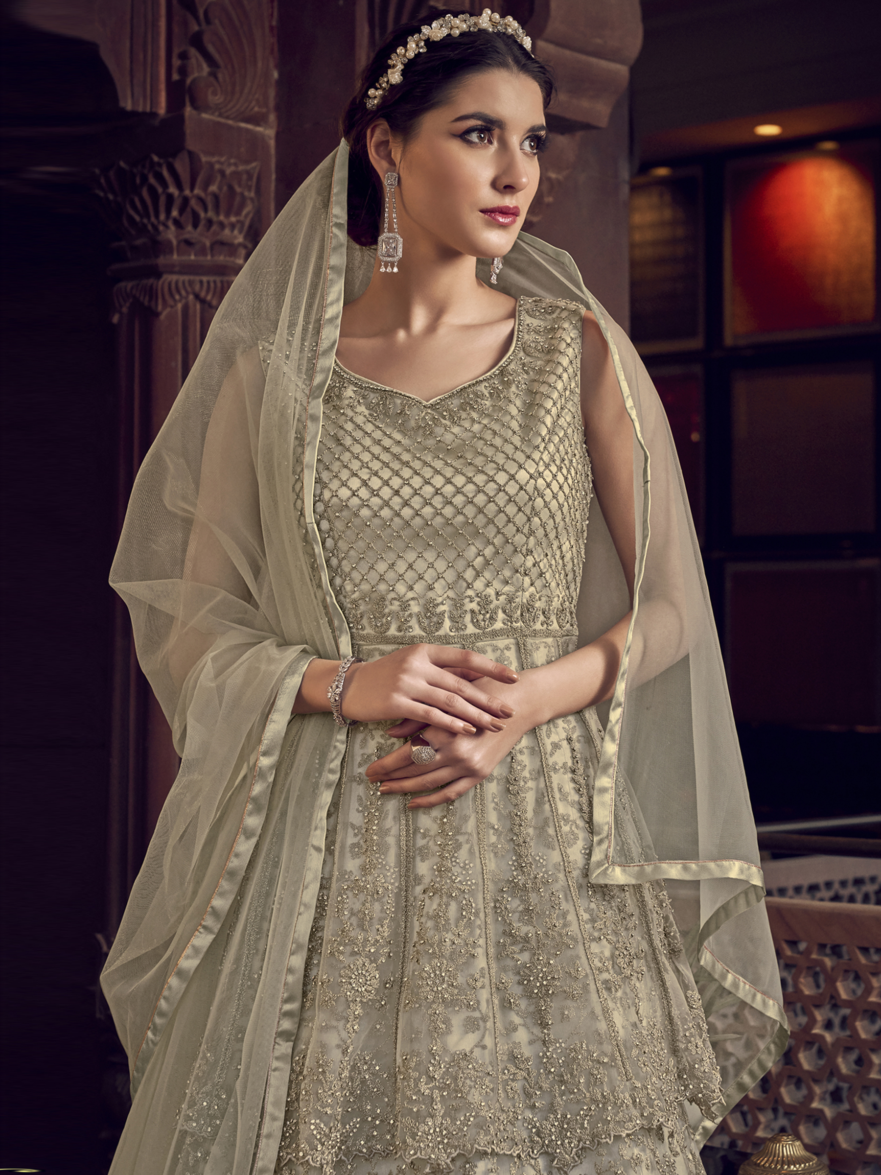 Stylee Lifestyle presents the all new collection of Embroidered Dress Material. Pair them with matching accessories to look trendy and gorgeous. Elegant Designer Cording Work With Crystal. DECLAIMER: The accessories on model are only for presentation purpose and not part of the product sold. The color of the product might slightly vary due to photoshoot effect or display brightness set-up. —————Full Product Details:- Colour Details: Top Colour: Cream, Bottom colour: Cream, Dupatta colour: Cream, Inner colour: Cream, Jacket colour: N/AFabric Details:- “Top Fabric:Net, Bottom Fabric: Satin, Dupatta Fabric: Net, Inner or Lining: Satin, Jacket Fabric:N/A, Size Details: Bust: 44″/Length: 58”, Bottom: 2.50 Mtr., Dupatta: 2.40 Mtr., Inner: AttachedOther Details:- Bottom Style: Churidar, Sleeve Type: Sleeveless, Neck Type: V Neck, Dress Style: Gown Style, Work: Embroidered