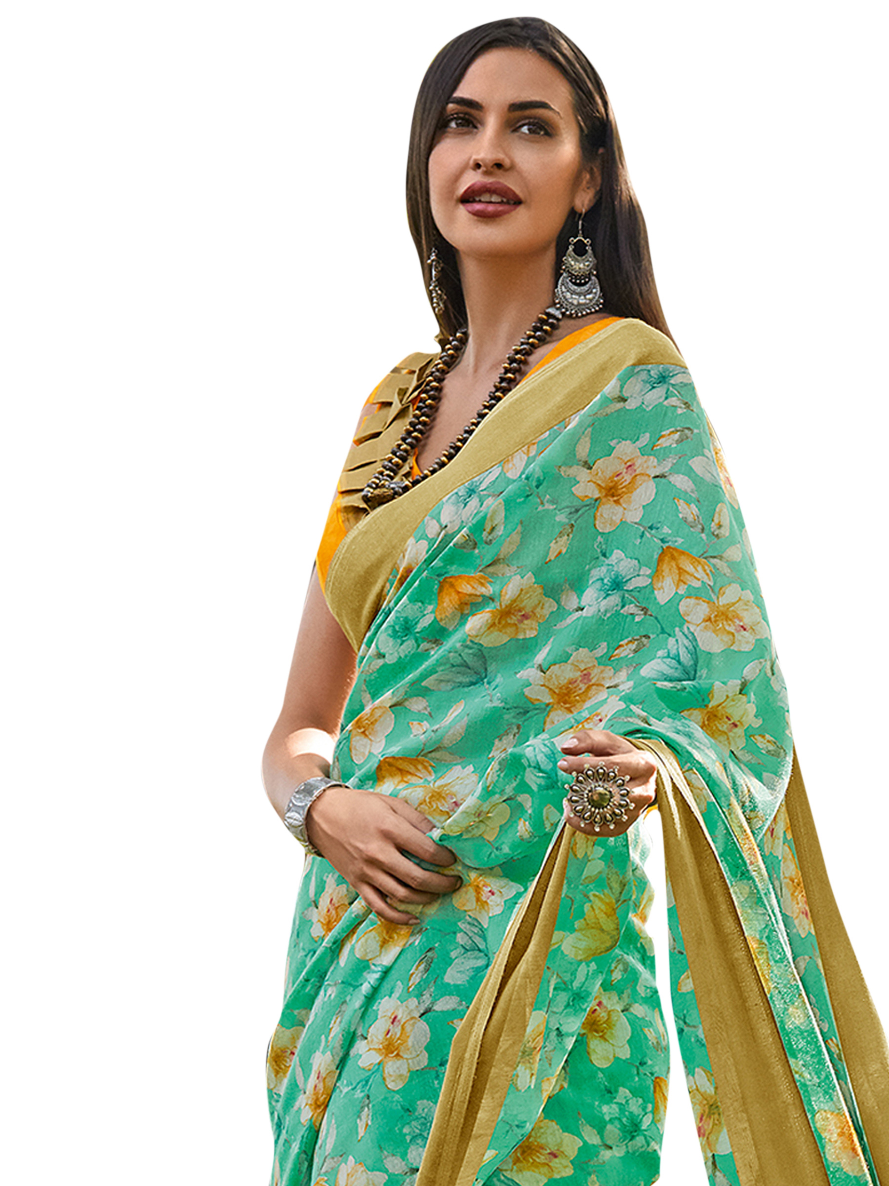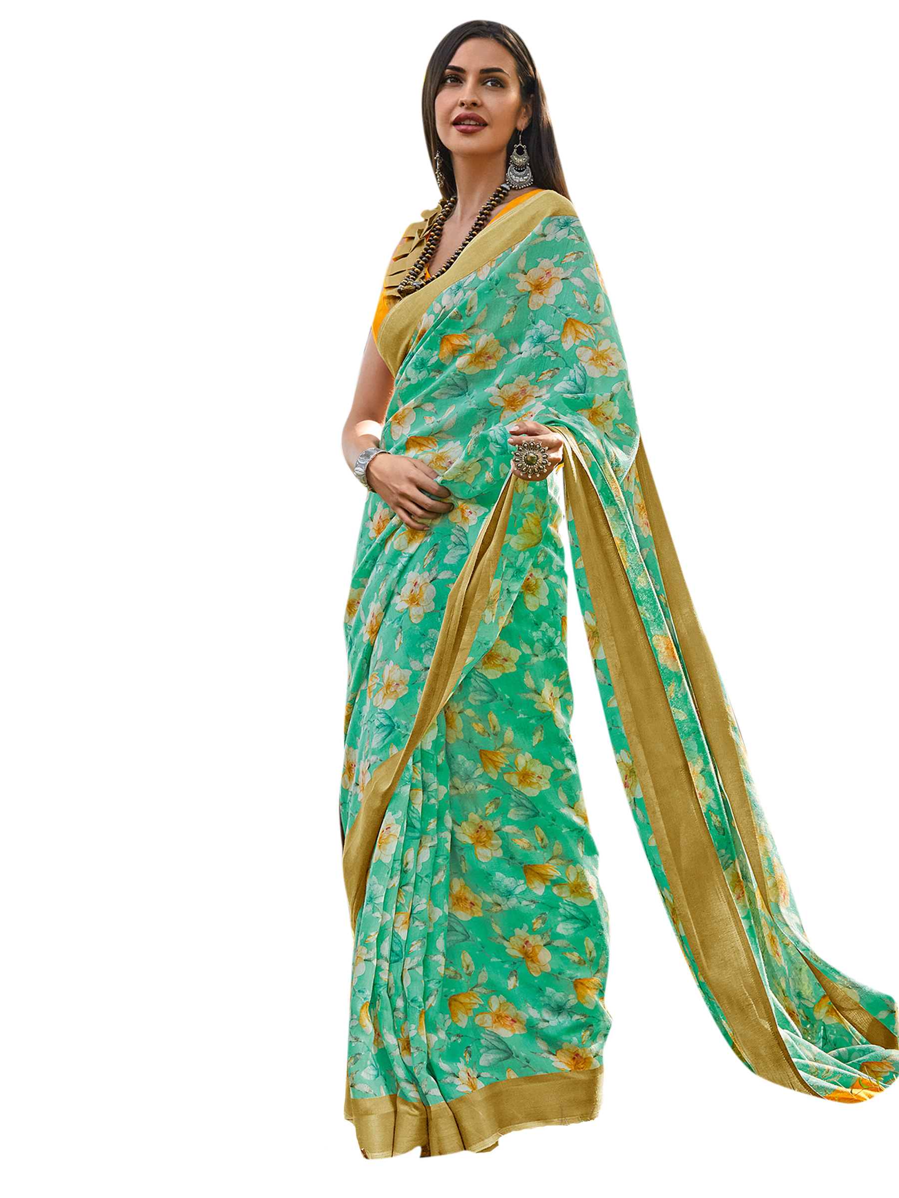 Stylee Lifestyle presents the all new collection of Cotton Blend Printed Saree. Pair them with matching accessories to look trendy and gorgeous. Allover Contrast Floral Print With Golden Jari Border. DECLAIMER: The accessories on model are only for presentation purpose and not part of the product sold. The color of the product might slightly vary due to photoshoot effect or display brightness set-up.…..Full Details:- Color Details: Q21Saree color: Beige, Blouse Color : Peach … Fabric Details:- Saree Fabric: Cotton Blend, Blouse Fabric: Cotton Blend …Size Details:- Saree : 5.5 Mtr., Blouse : 0.8 Mtr.