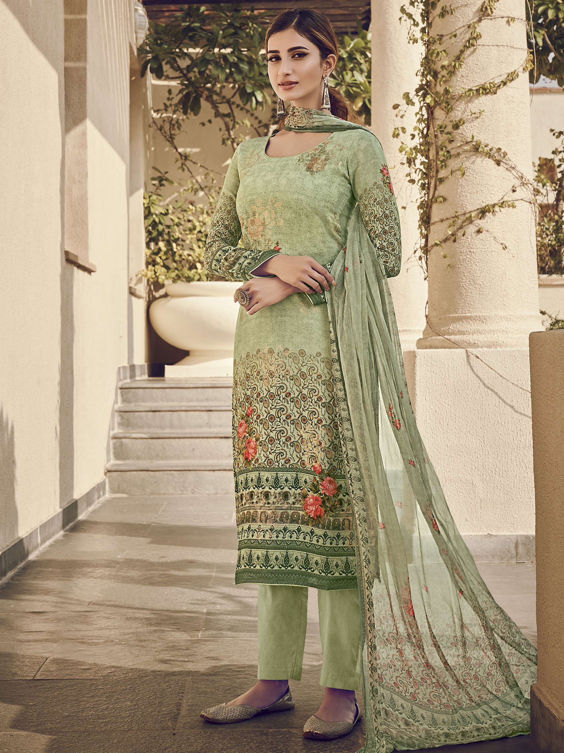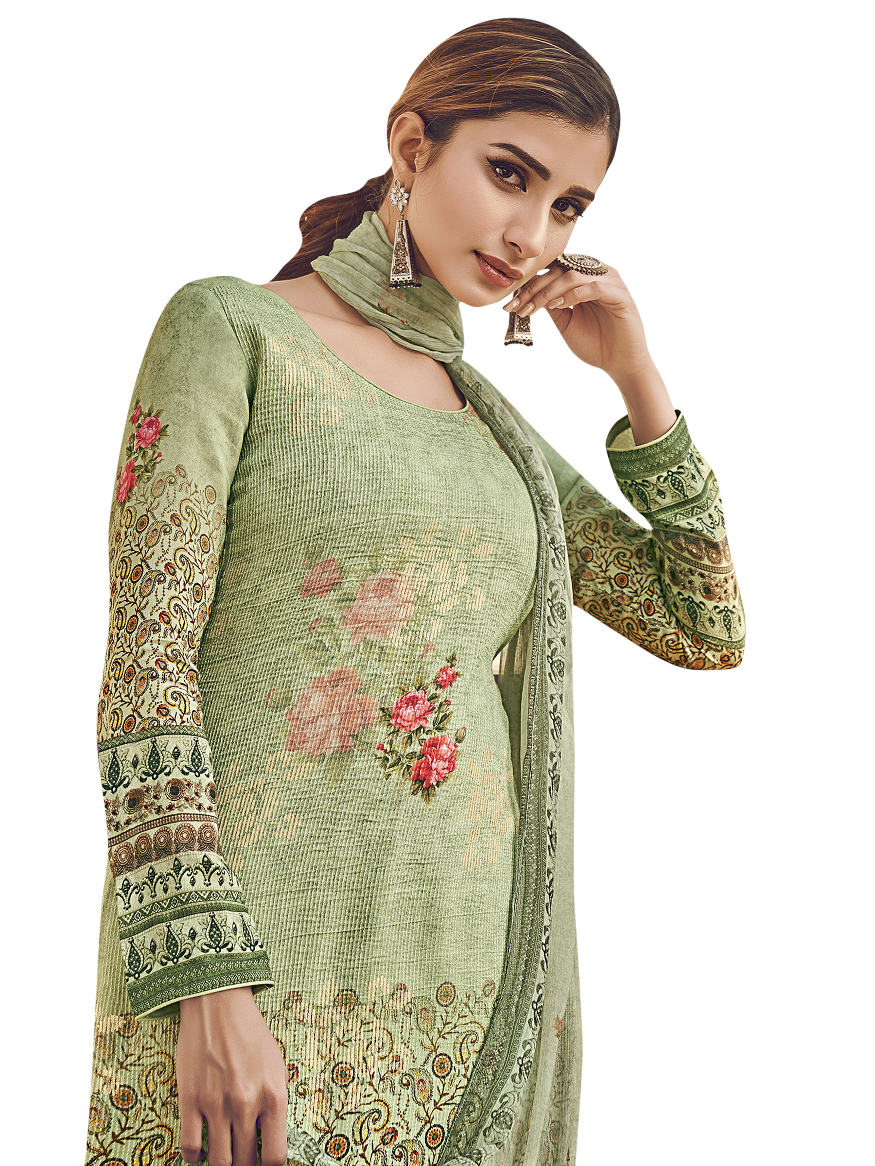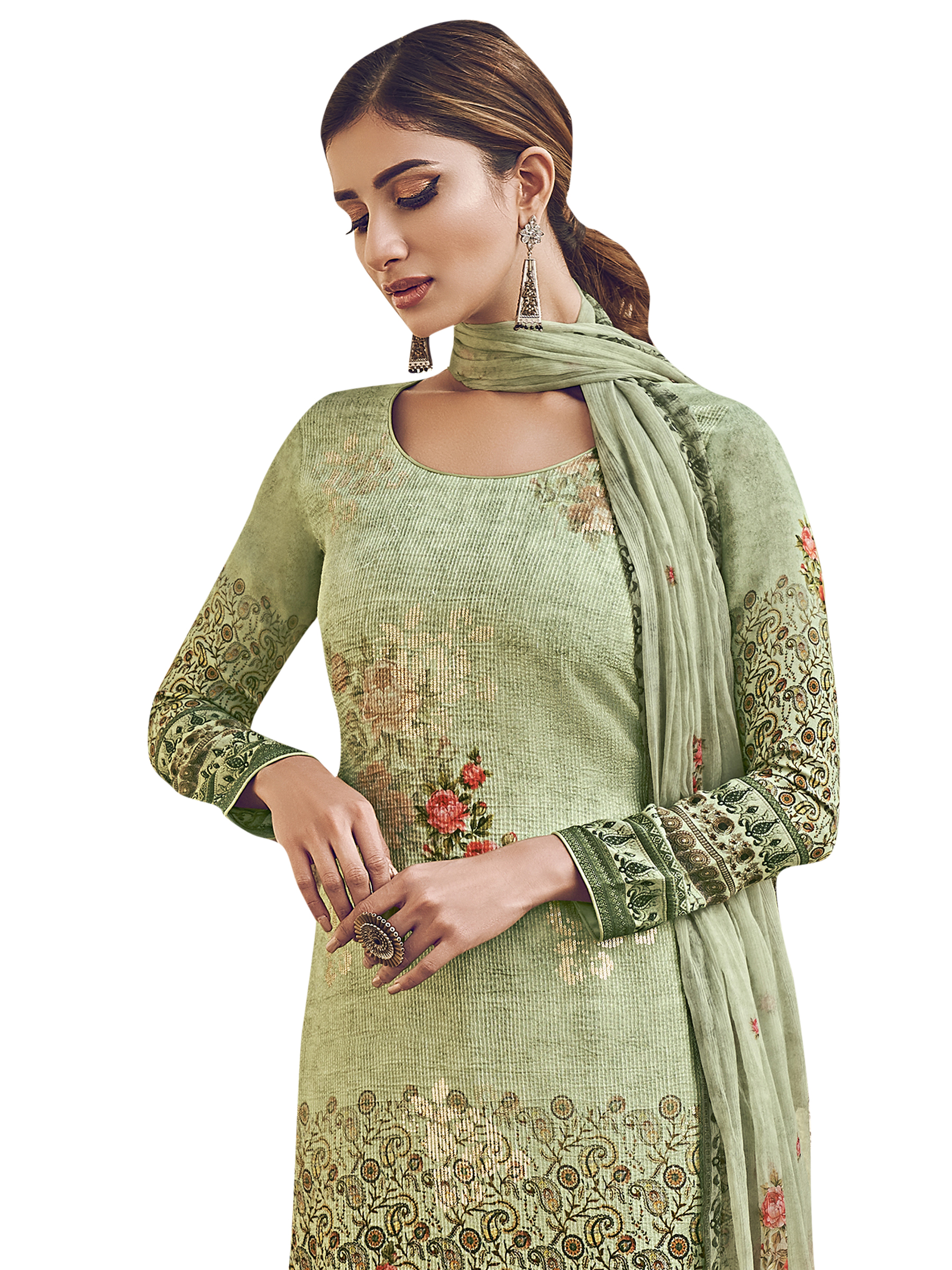 Stylee Lifestyle presents the all new collection of Digital Printed Dress Material. Pair them with matching accessories to look trendy and gorgeous. Allover Floral Digital Print With Sequin & Digital Printed Dupatta. DECLAIMER: The accessories on model are only for presentation purpose and not part of the product sold. The color of the product might slightly vary due to photoshoot effect or display brightness set-up. —————Full Product Details:- Colour Details: Top Colour: Green, Bottom colour: Green, Dupatta colour: Green, Inner colour: N/A, Jacket colour: N/AFabric Details:- “Top Fabric:Pure Silk, Bottom Fabric: Jam Satin, Dupatta Fabric: Chinon Chiffon, Inner or Lining: N/A, Jacket Fabric:N/A, Size Details: Top: 2.50 Mtr., Bottom: 2.50 Mtr., Dupatta: 2.30 Mtr.Other Details:- Bottom Style: Pant Style, Sleeve Type: Full Sleeve, Neck Type: Round, Dress Style: A Line Style, Work: Digital Printed