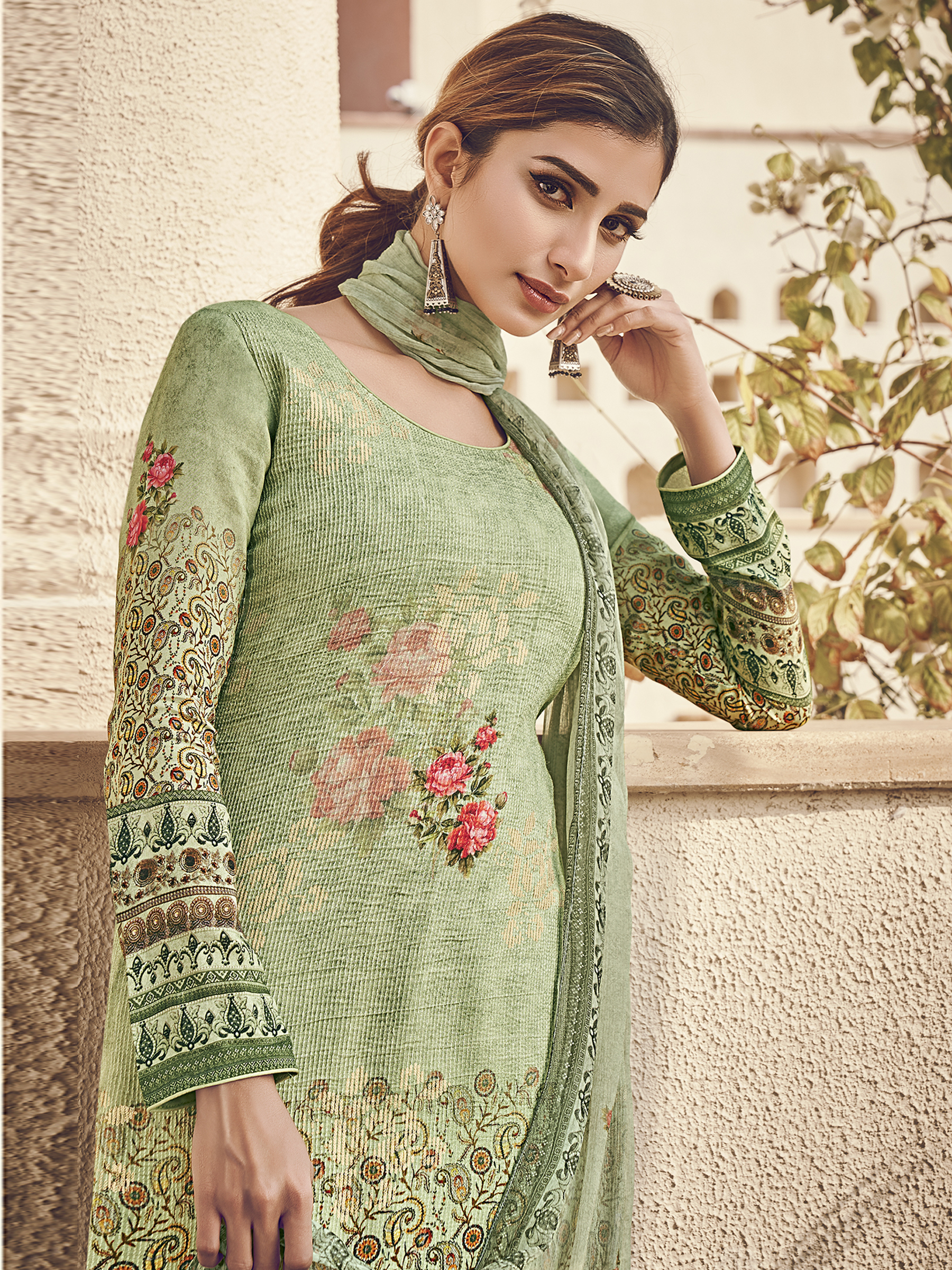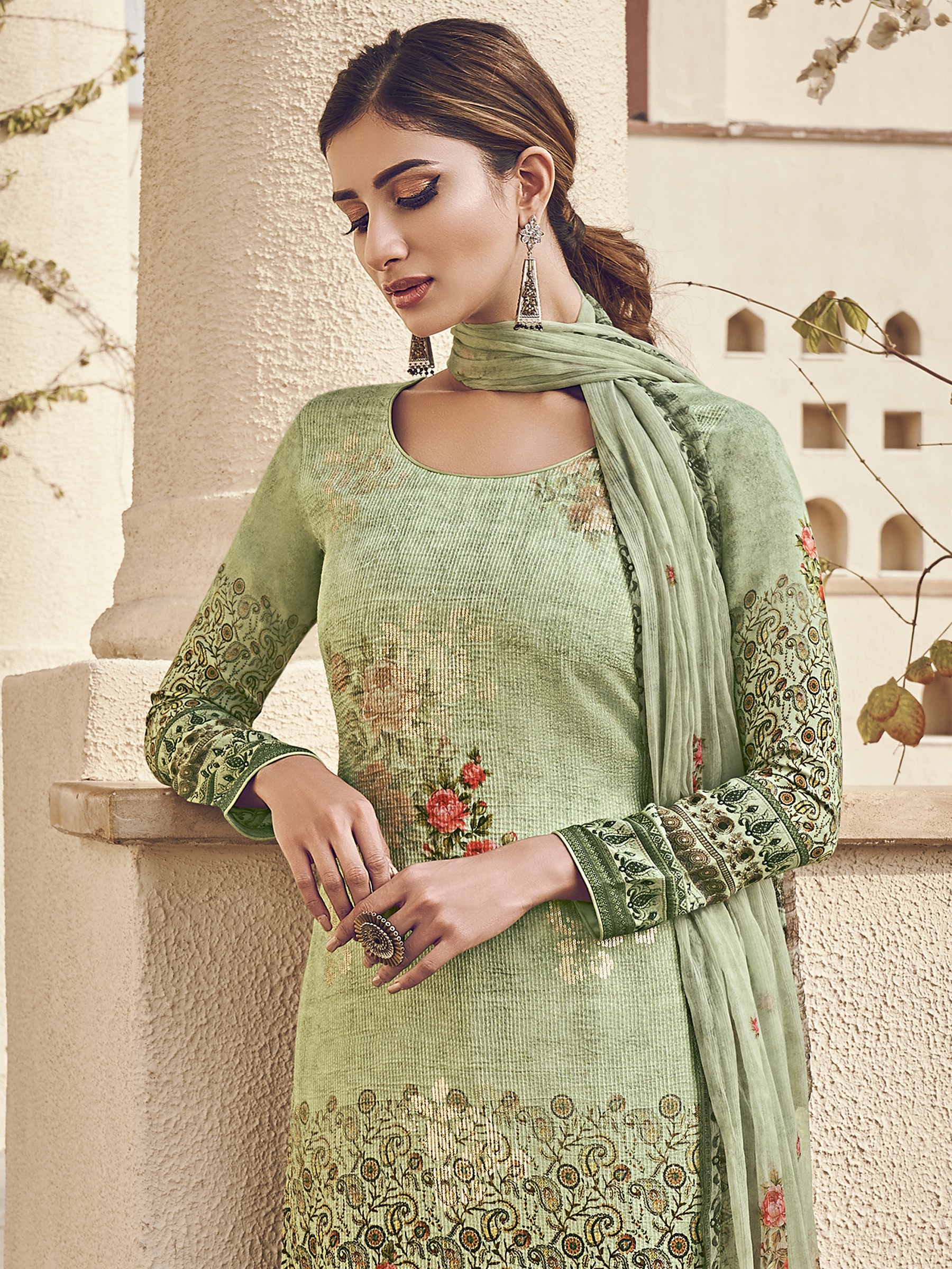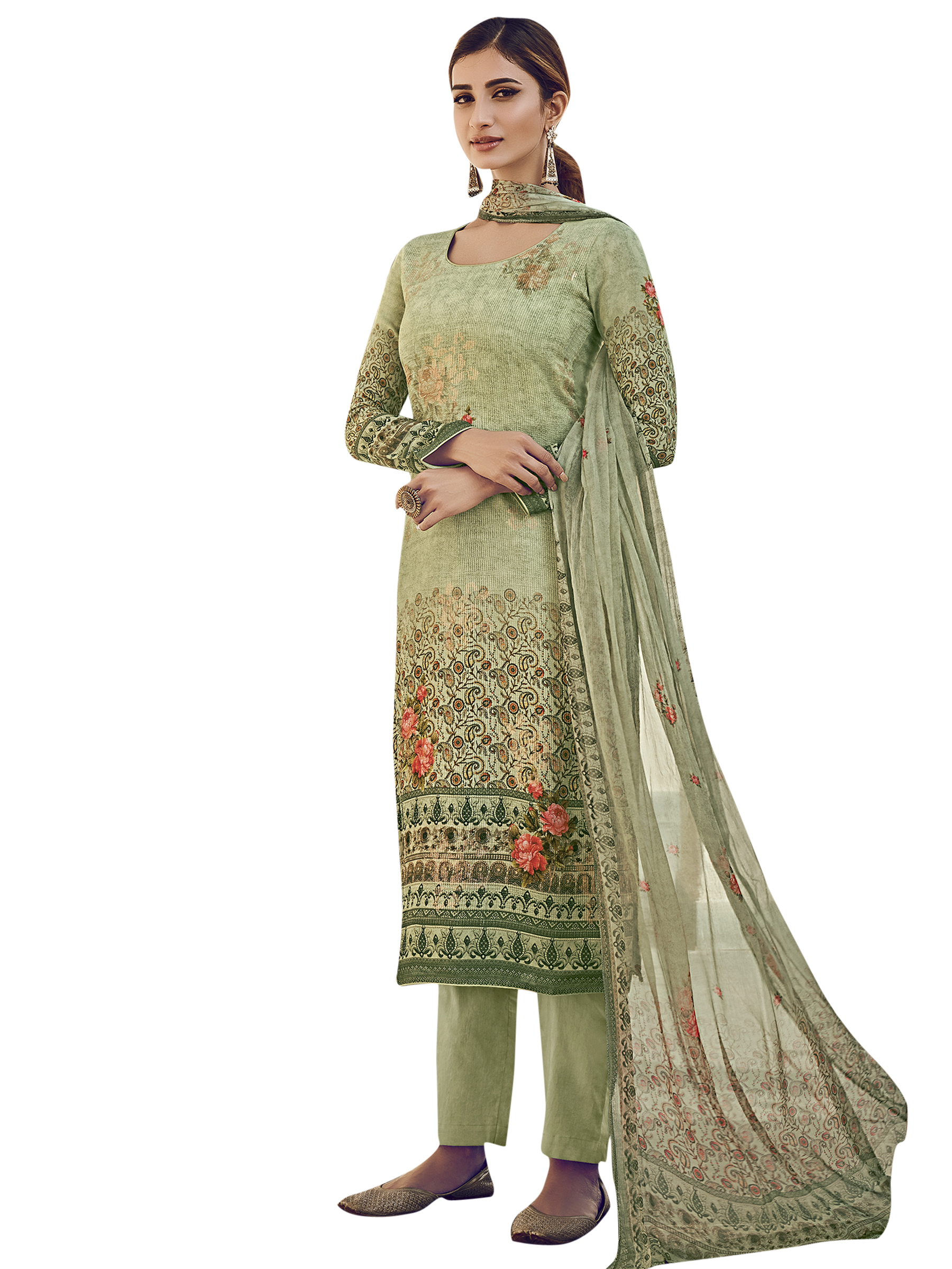 Stylee Lifestyle presents the all new collection of Digital Printed Dress Material. Pair them with matching accessories to look trendy and gorgeous. Allover Floral Digital Print With Sequin & Digital Printed Dupatta. DECLAIMER: The accessories on model are only for presentation purpose and not part of the product sold. The color of the product might slightly vary due to photoshoot effect or display brightness set-up. —————Full Product Details:- Colour Details: Top Colour: Green, Bottom colour: Green, Dupatta colour: Green, Inner colour: N/A, Jacket colour: N/AFabric Details:- “Top Fabric:Pure Silk, Bottom Fabric: Jam Satin, Dupatta Fabric: Chinon Chiffon, Inner or Lining: N/A, Jacket Fabric:N/A, Size Details: Top: 2.50 Mtr., Bottom: 2.50 Mtr., Dupatta: 2.30 Mtr.Other Details:- Bottom Style: Pant Style, Sleeve Type: Full Sleeve, Neck Type: Round, Dress Style: A Line Style, Work: Digital Printed