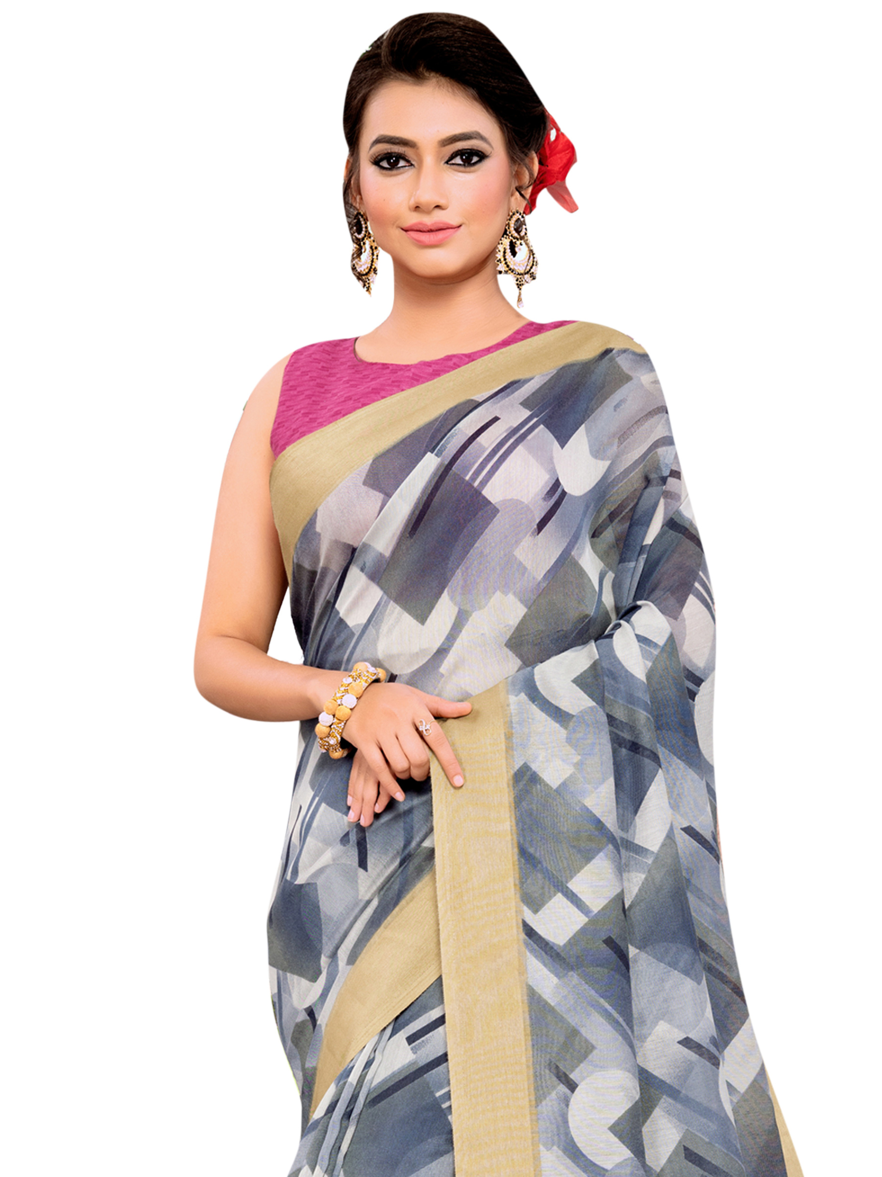 Grey Cotton Blend Printed Saree