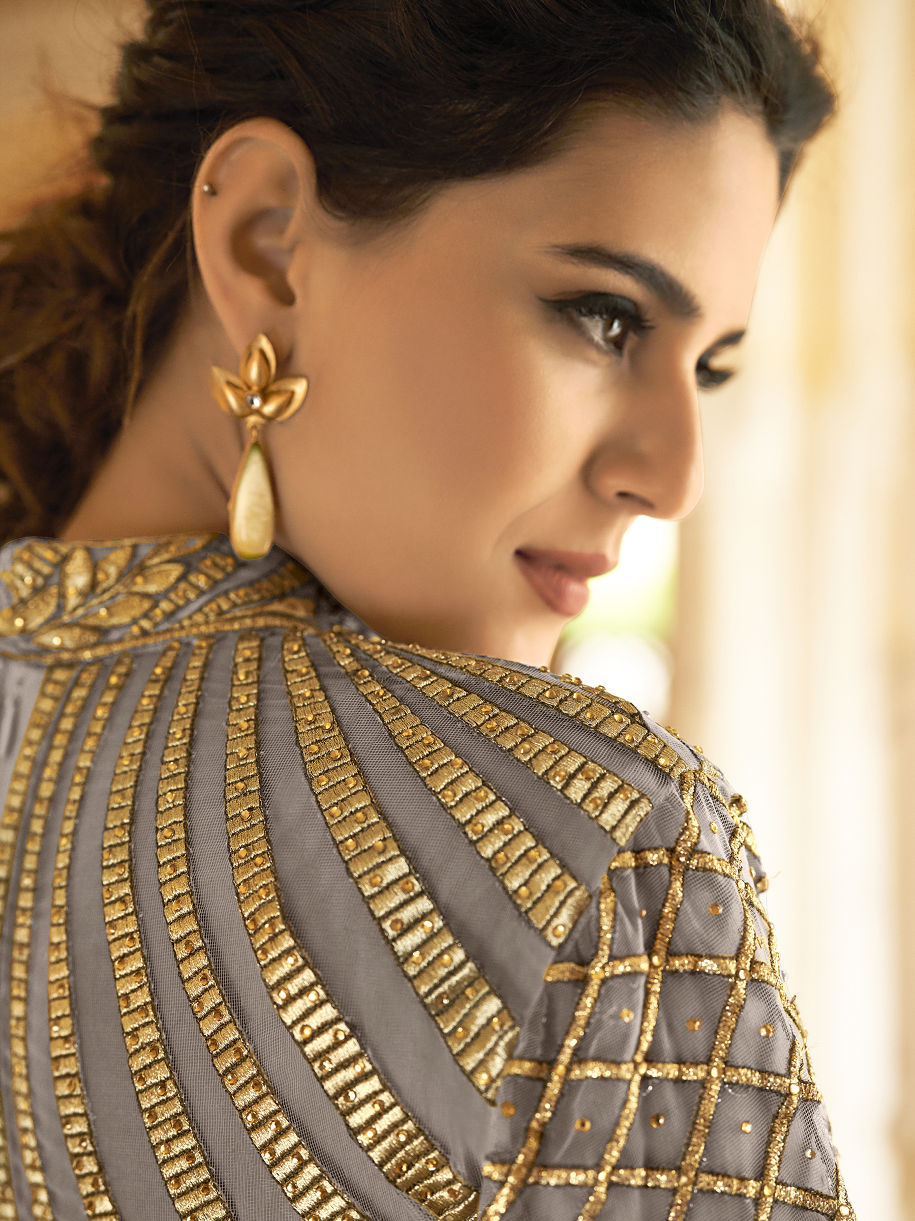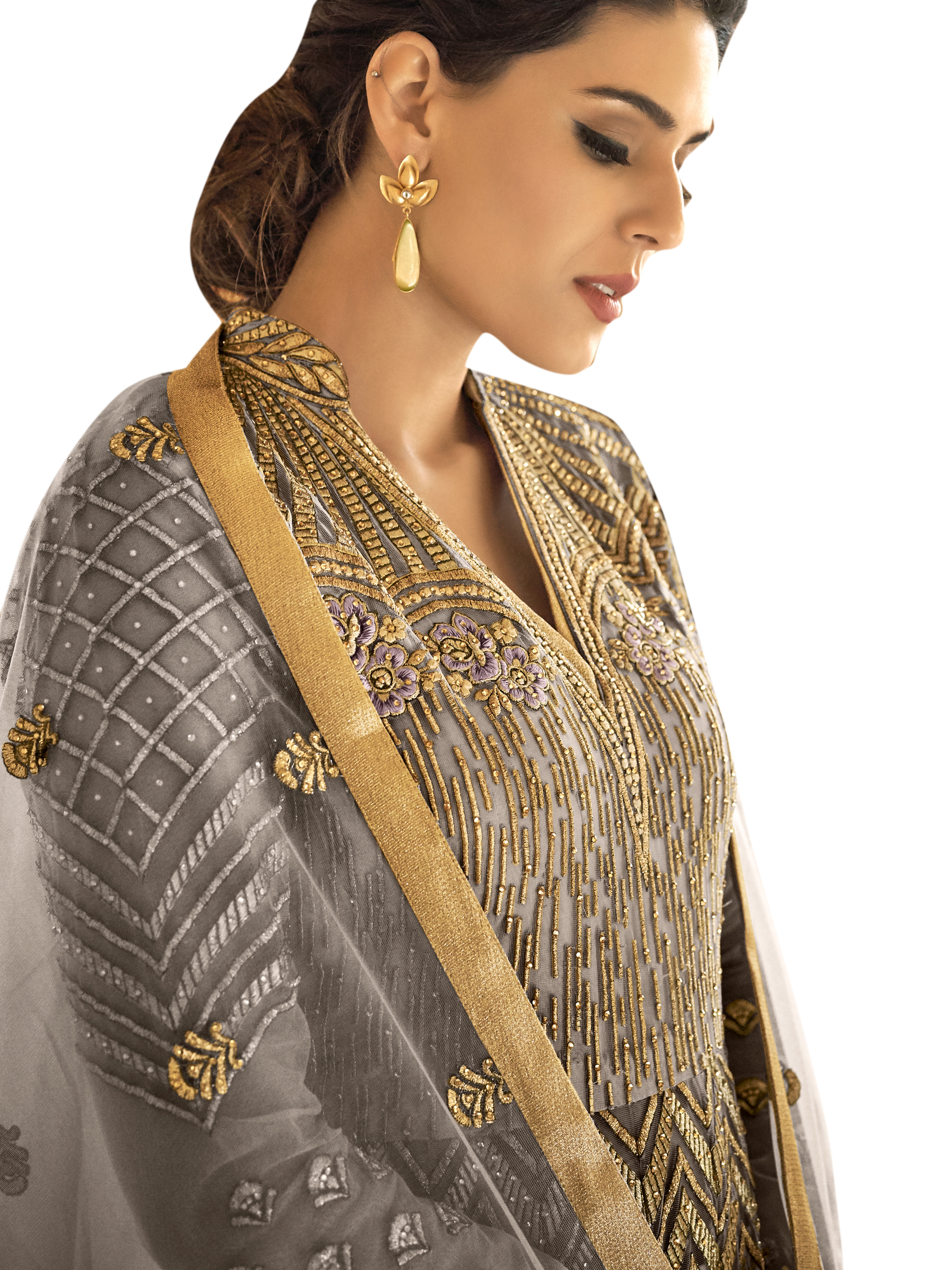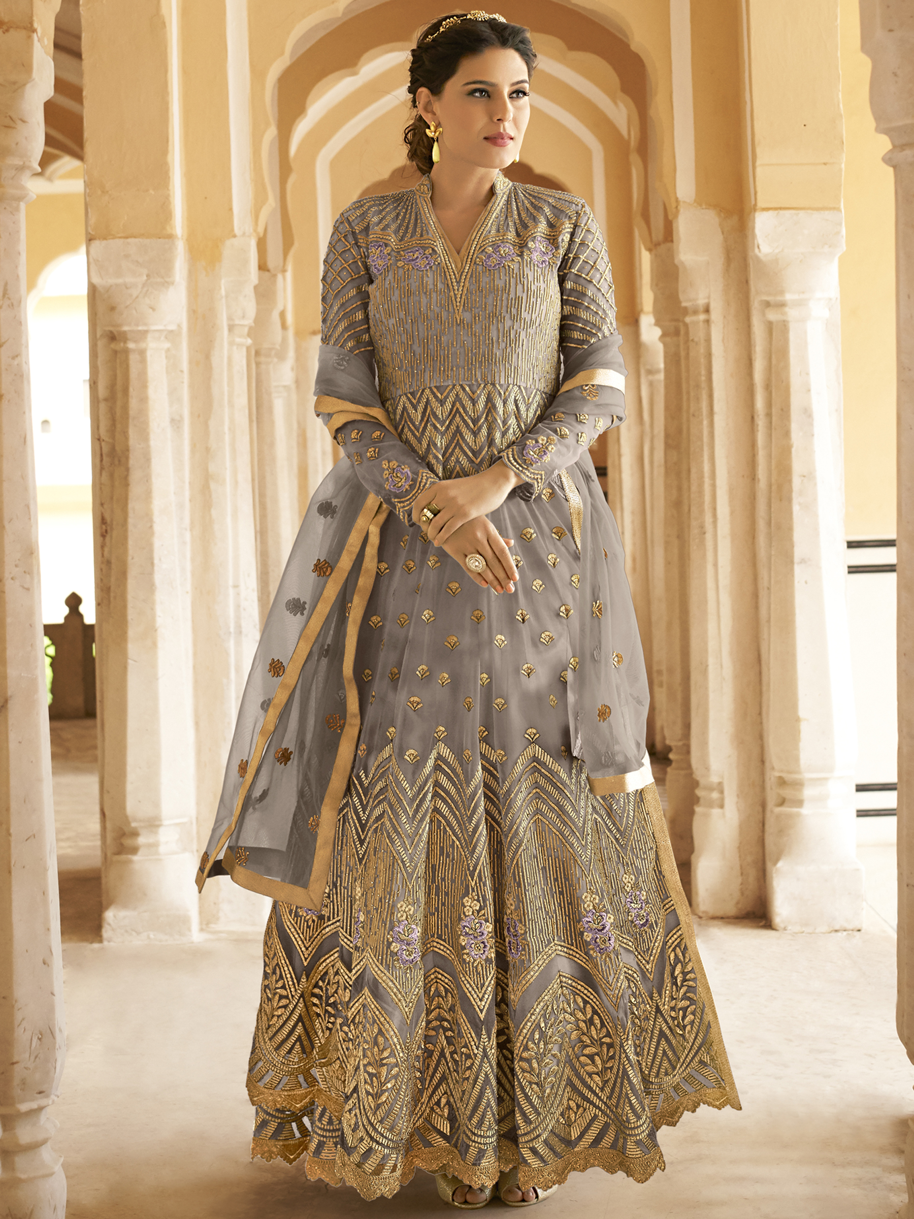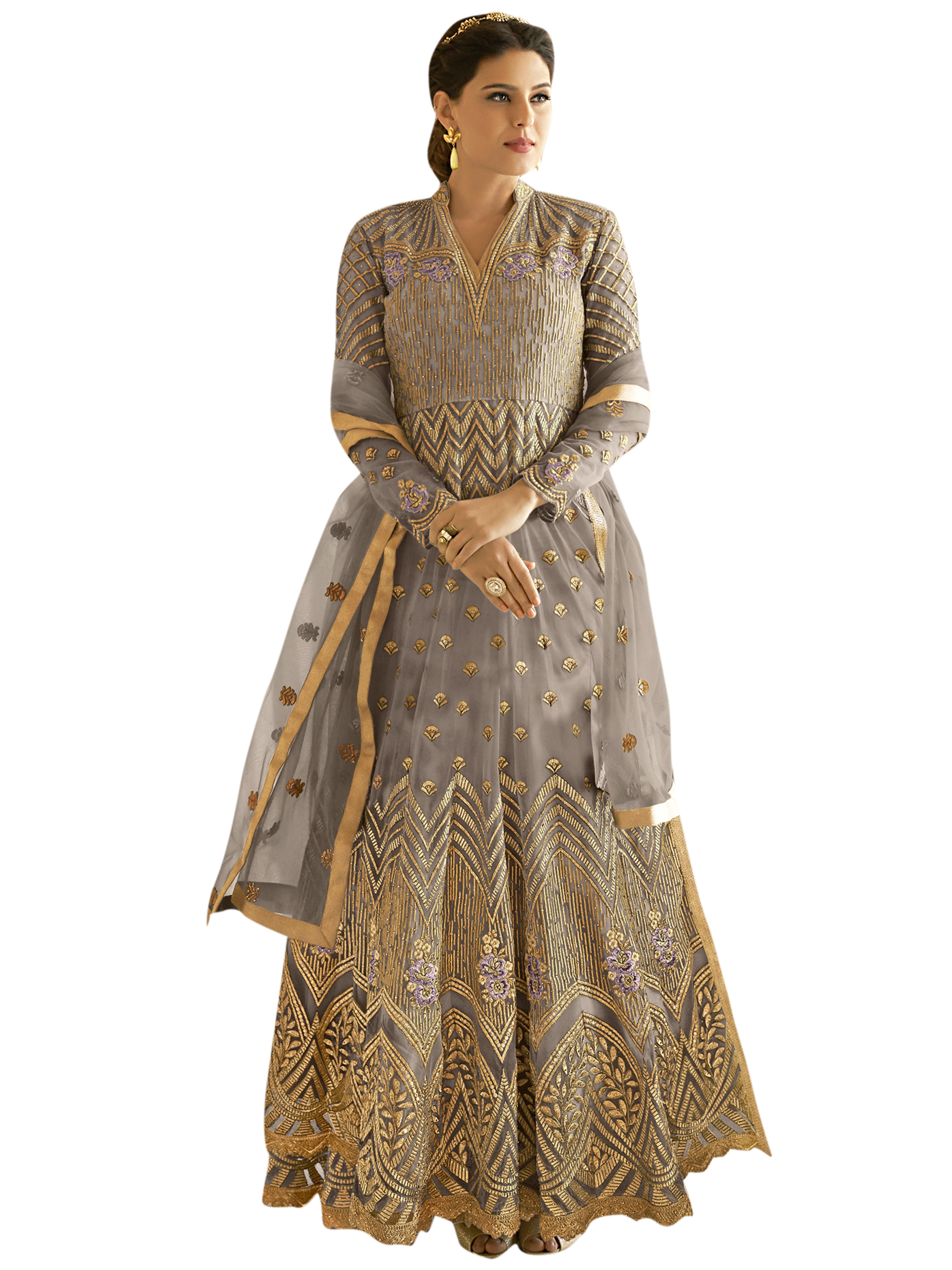 Stylee Lifestyle presents the all new collection of Embroidered Dress Material. Pair them with matching accessories to look trendy and gorgeous. Embellished Jardoshi Work With Multiple Jari & Resham Thread Work, Crystal. DECLAIMER: The accessories on model are only for presentation purpose and not part of the product sold. The color of the product might slightly vary due to photoshoot effect or display brightness set-up. —————Full Product Details:- Colour Details: Top Colour: Grey, Bottom colour: Grey, Dupatta colour: Grey, Inner colour: Grey, Jacket colour: N/AFabric Details:- “Top Fabric:Net, Bottom Fabric: Santoon, Dupatta Fabric: Net, Inner or Lining: Santoon, Jacket Fabric:N/A, Size Details: Bust: 48″/Length: 54”, Bottom: 2.50 Mtr., Dupatta: 2.30 Mtr., Inner: 2.50 MtrOther Details:- Bottom Style: Churidar, Sleeve Type: Full Sleeve, Neck Type: V Neck, Dress Style: Anarkali Style, Work: Embroidered