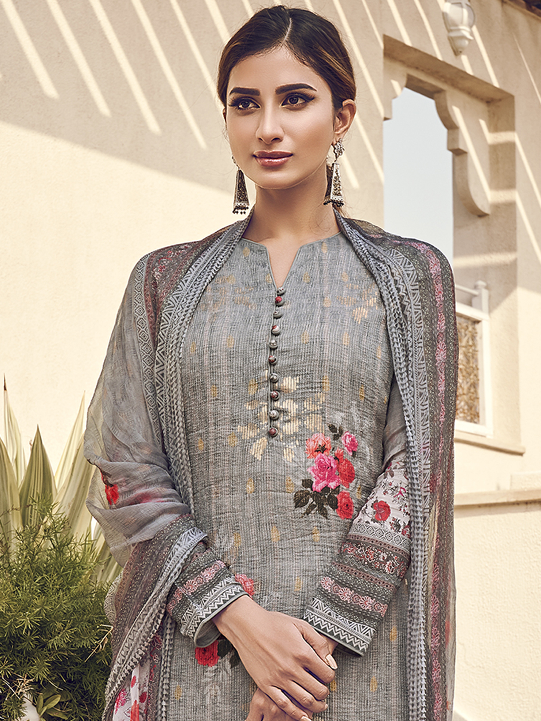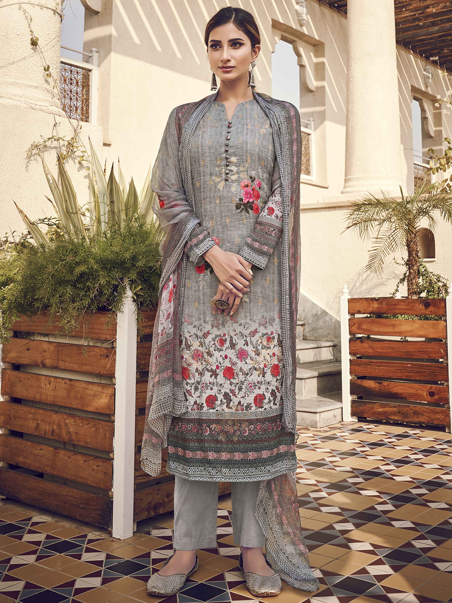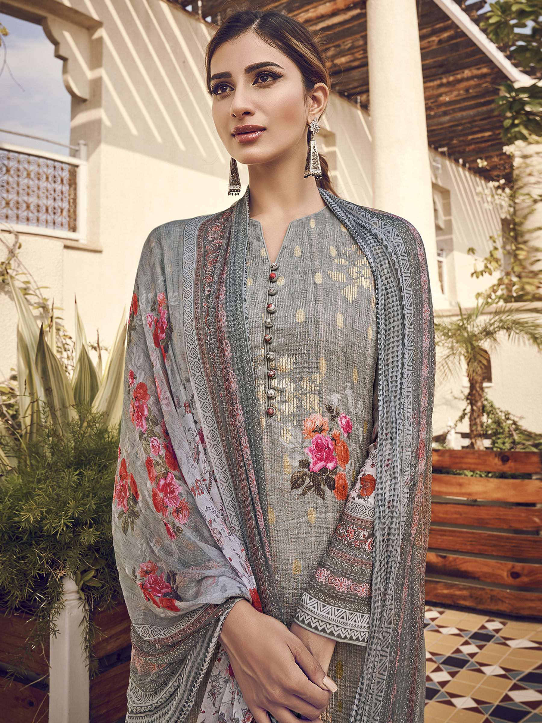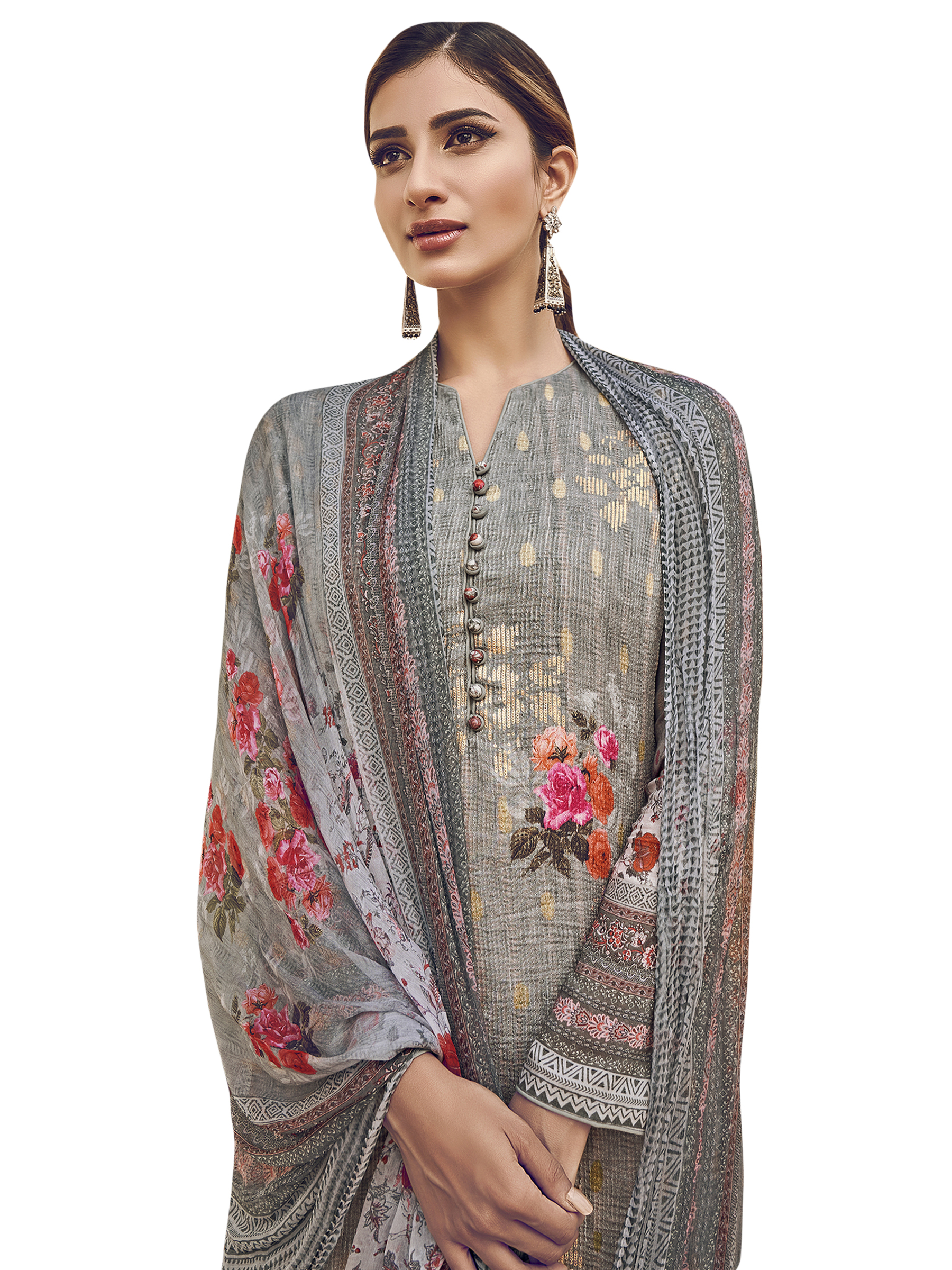 Stylee Lifestyle presents the all new collection of Digital Printed Dress Material. Pair them with matching accessories to look trendy and gorgeous. Allover Floral Digital Print With Sequin & Digital Printed Dupatta. DECLAIMER: The accessories on model are only for presentation purpose and not part of the product sold. The color of the product might slightly vary due to photoshoot effect or display brightness set-up. —————Full Product Details:- Colour Details: Top Colour: Grey, Bottom colour: Grey, Dupatta colour: Grey, Inner colour: N/A, Jacket colour: N/AFabric Details:- “Top Fabric:Pure Silk, Bottom Fabric: Jam Satin, Dupatta Fabric: Chinon Chiffon, Inner or Lining: N/A, Jacket Fabric:N/A, Size Details: Top: 2.50 Mtr., Bottom: 2.50 Mtr., Dupatta: 2.30 Mtr.Other Details:- Bottom Style: Pant Style, Sleeve Type: Full Sleeve, Neck Type: V Neck, Dress Style: A Line Style, Work: Digital Printed