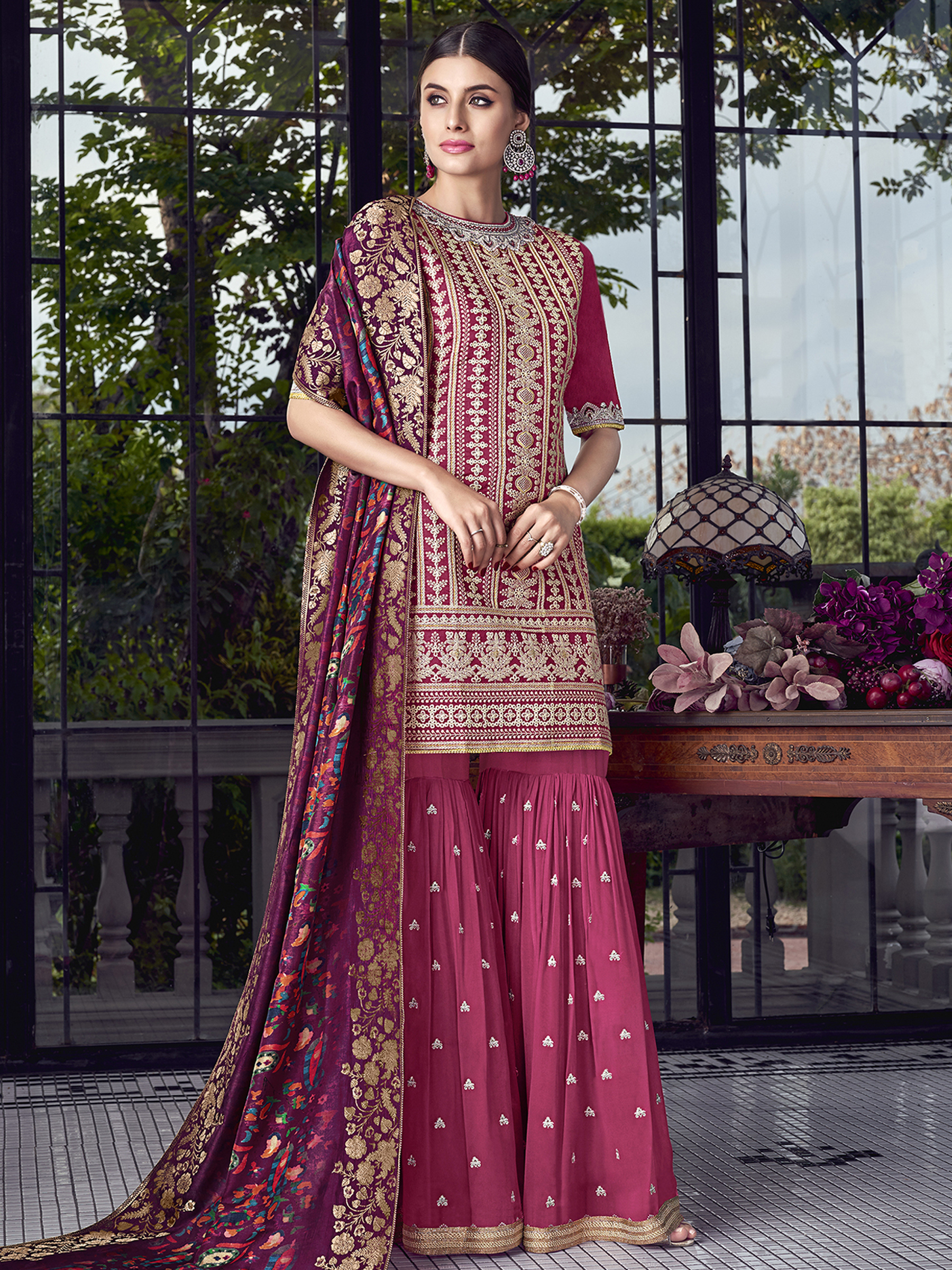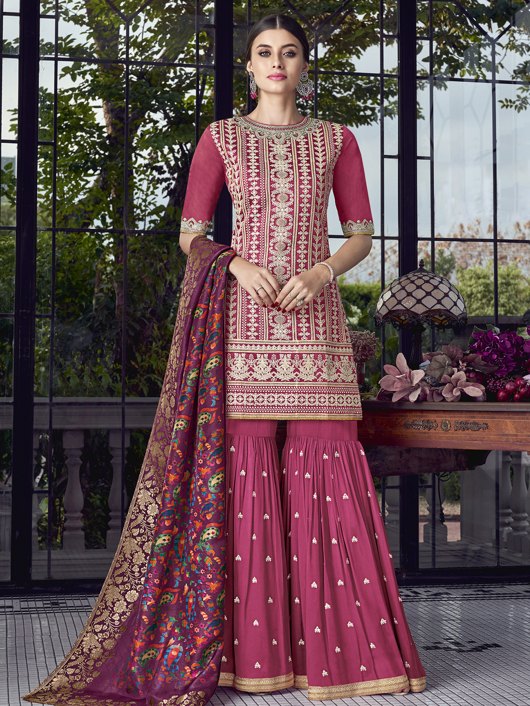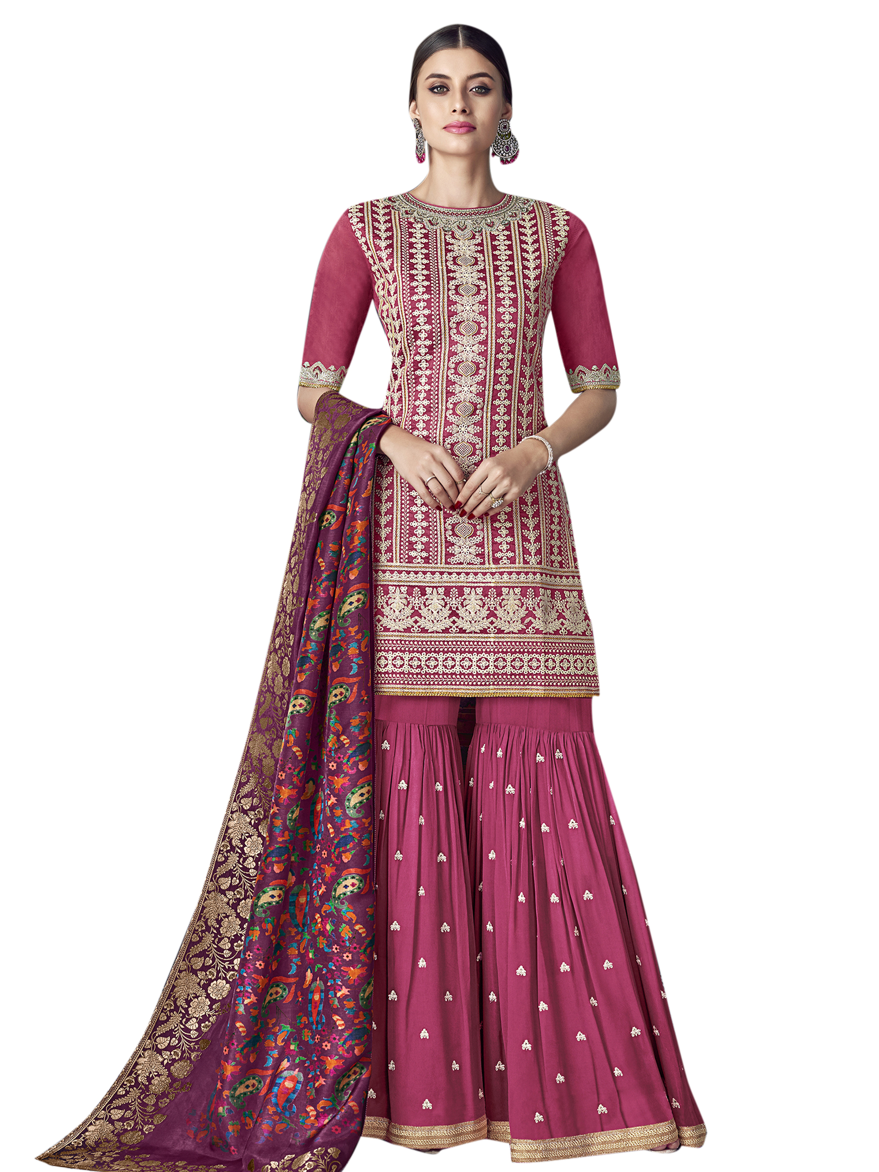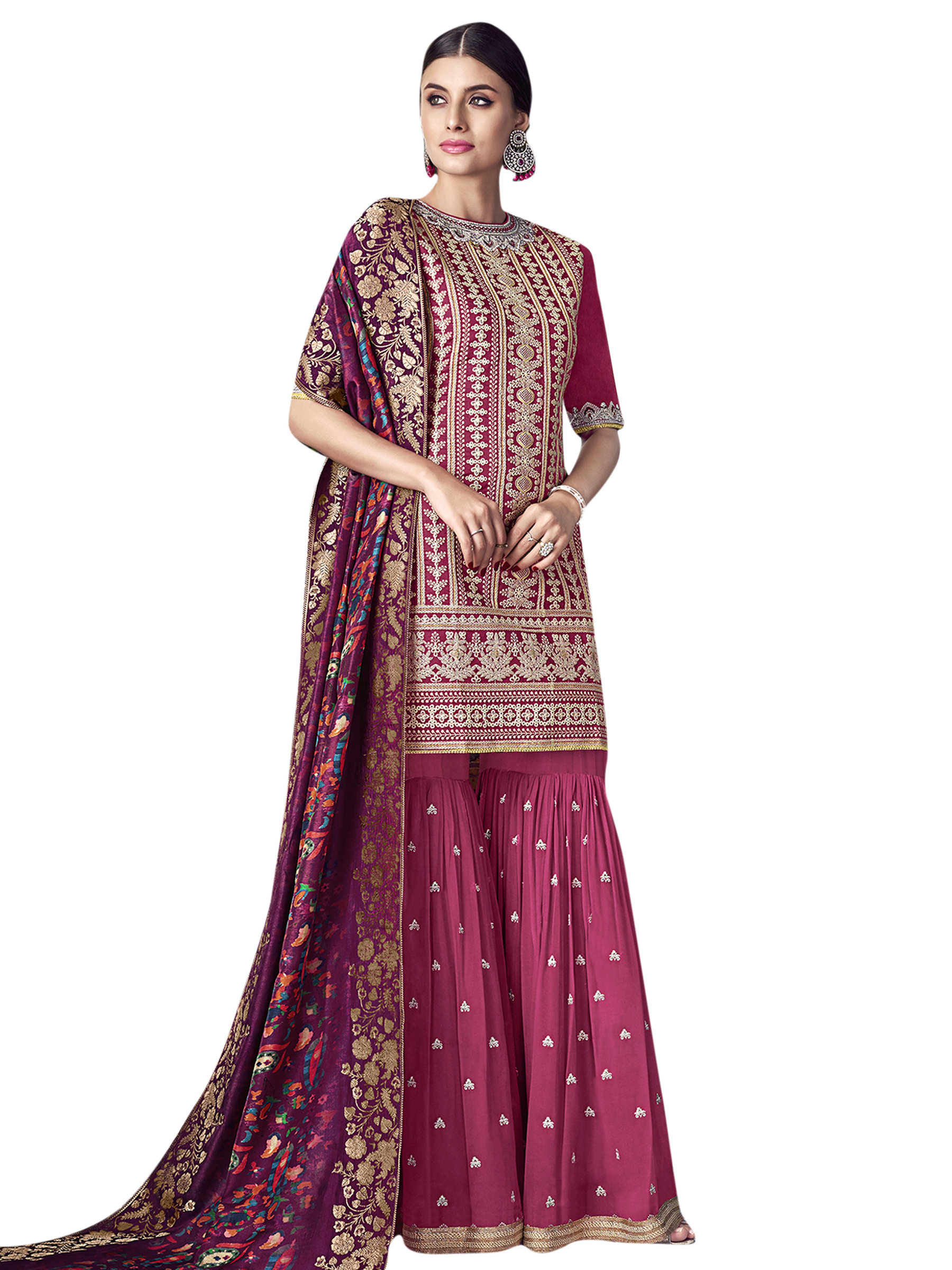 Stylee Lifestyle presents the all new collection of Embroidered Dress Material. Pair them with matching accessories to look trendy and gorgeous. Allover Lakhnavi Resham Thread Work With Jardoshi Hand Work & Crystal, Digital Printed Dupatta. DECLAIMER: The accessories on model are only for presentation purpose and not part of the product sold. The color of the product might slightly vary due to photoshoot effect or display brightness set-up. —————Full Product Details:- Colour Details: Top Colour: Magenta, Bottom colour: Magenta, Dupatta colour: Magenta, Inner colour: Magenta, Jacket colour: N/AFabric Details:- “Top Fabric:Chanderi Silk, Bottom Fabric: Georgette, Dupatta Fabric: Satin Jacquard, Inner or Lining: Santoon, Jacket Fabric:N/A, Size Details: Bust: 56″/Length: 40”, Bottom: 3.50 Mtr., Dupatta: 2.40 Mtr., Inner: 1.60 MtrOther Details:- Bottom Style: Sharara Style, Sleeve Type: Half Sleeve, Neck Type: Round, Dress Style: A Line Style, Work: Embroidered