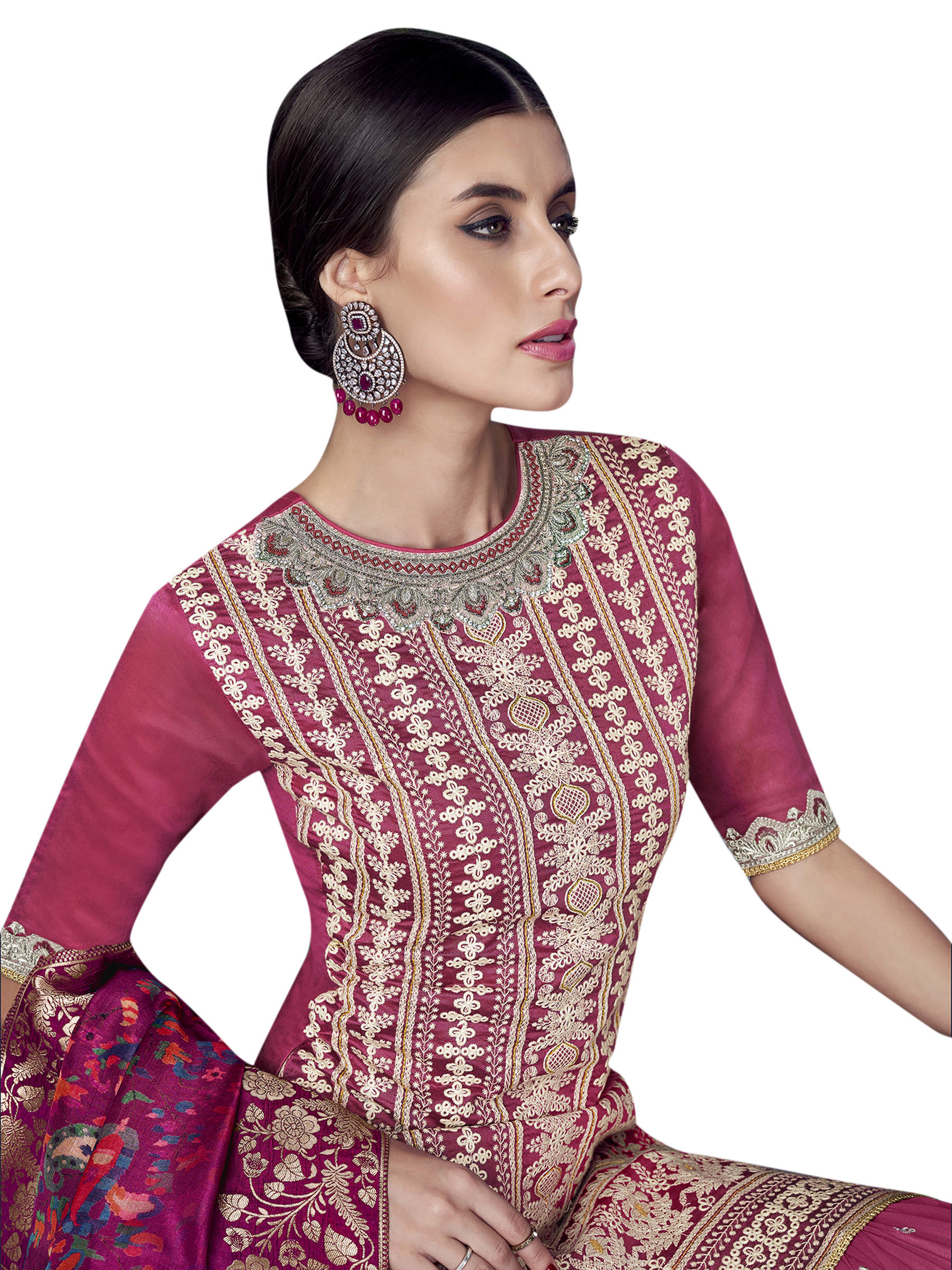 Magenta Chanderi Silk Embroidered Dress Material