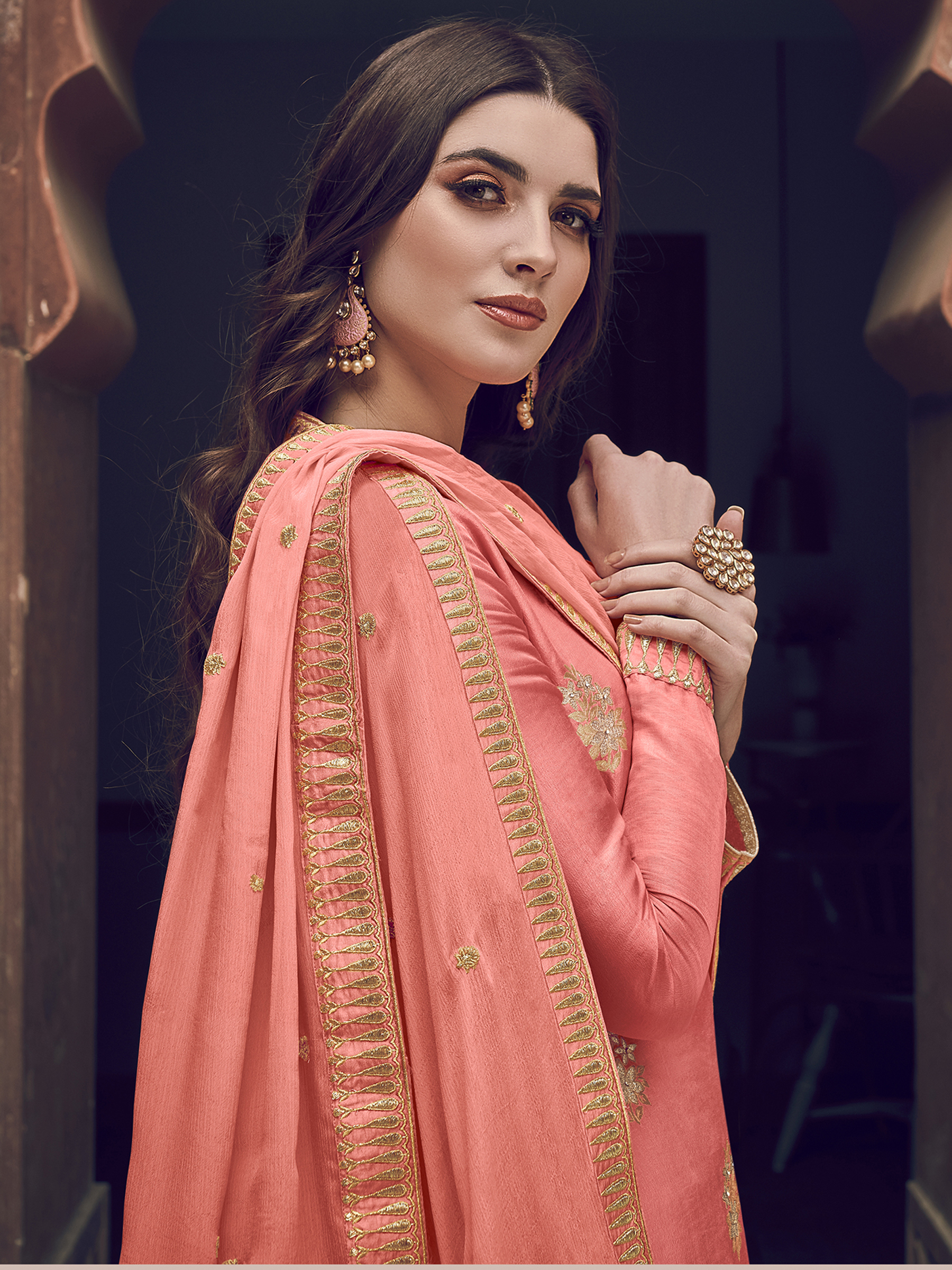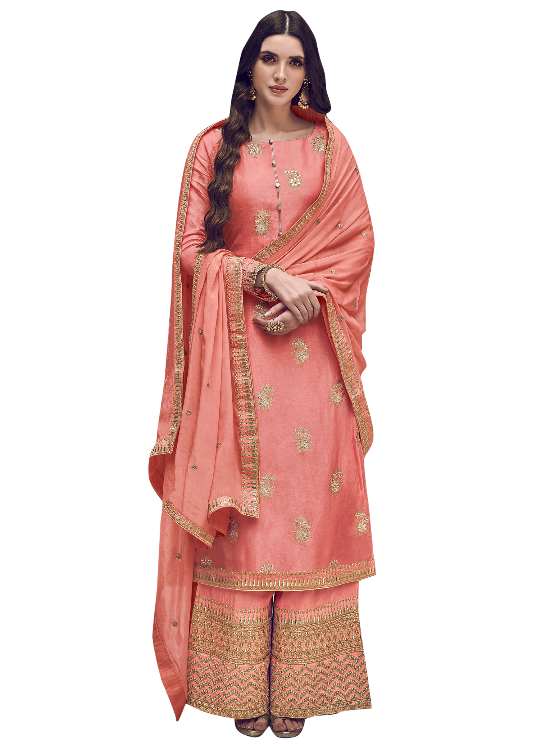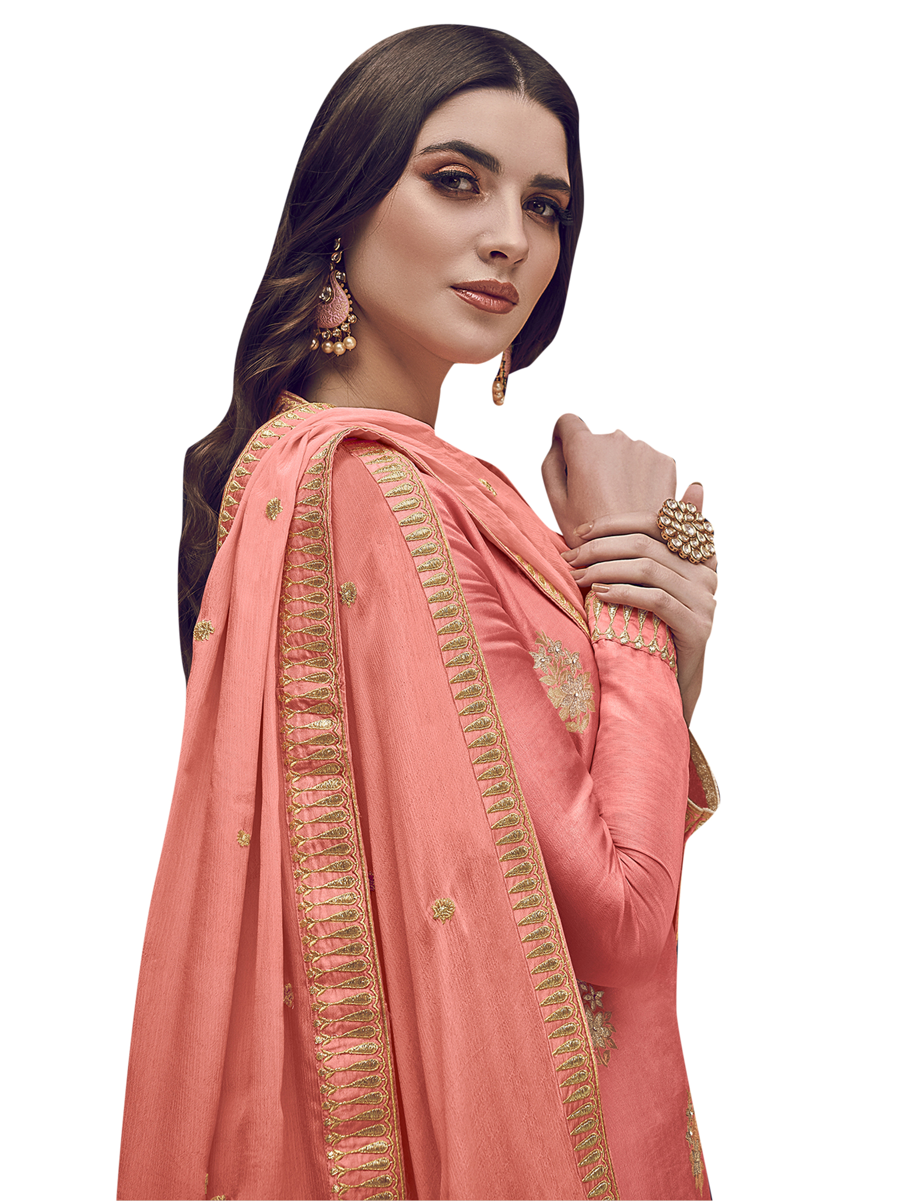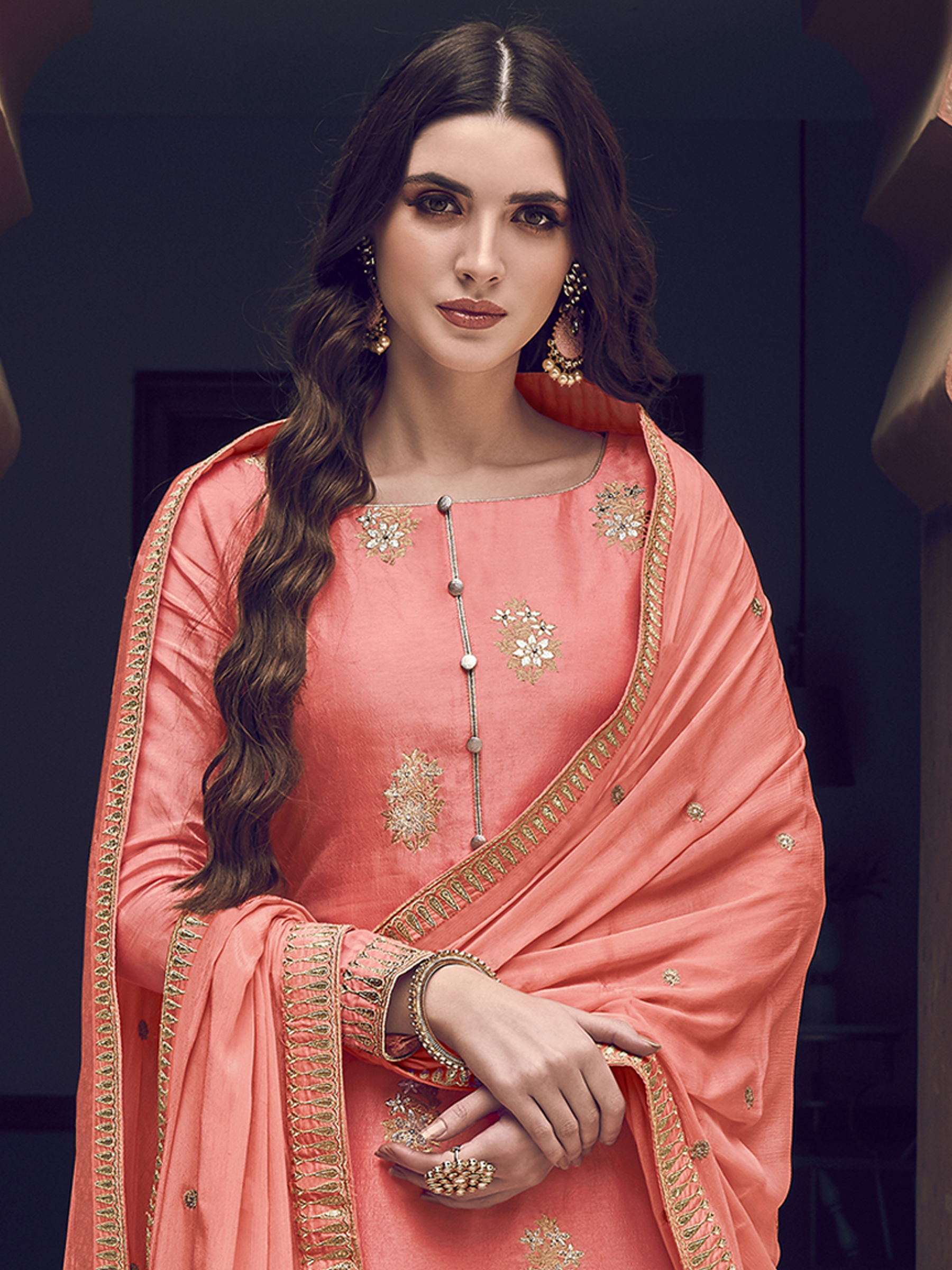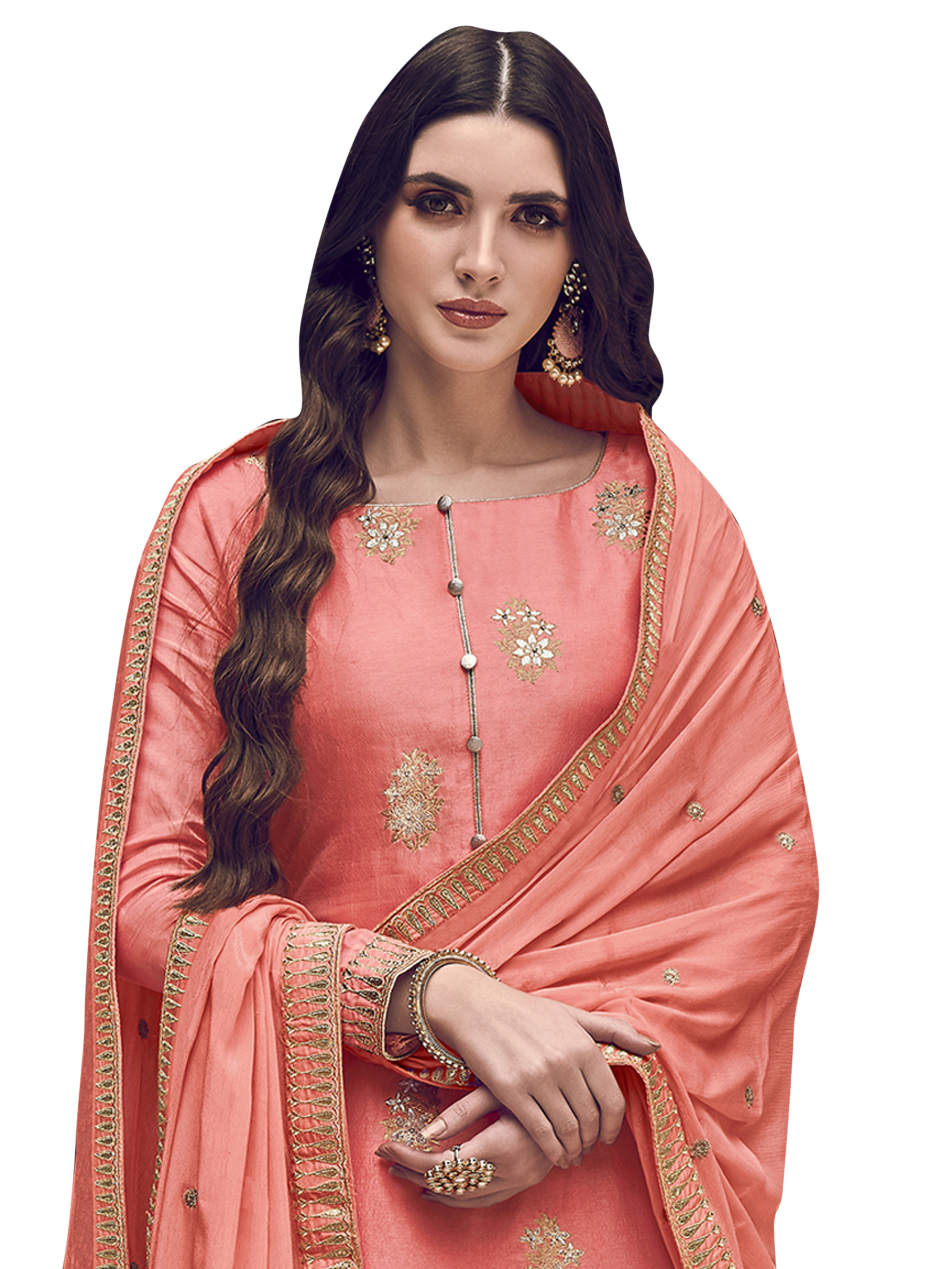 Stylee Lifestyle presents the all new collection of Embroidered Dress Material. Pair them with matching accessories to look trendy and gorgeous. Elegant Floral Jacquard Woven Design With Jardoshi Work & Embroidered Lace. DECLAIMER: The accessories on model are only for presentation purpose and not part of the product sold. The color of the product might slightly vary due to photoshoot effect or display brightness set-up. —————Full Product Details:- Colour Details: Top Colour: Peach, Bottom colour: Peach, Dupatta colour: Peach, Inner colour: N/A, Jacket colour: N/AFabric Details:- “Top Fabric:Dola Silk, Bottom Fabric: Dola Silk, Dupatta Fabric: Chiffon, Inner or Lining: N/A, Jacket Fabric:N/A, Size Details: Top: 2.40 Mtr., Bottom: 2.20 Mtr., Dupatta: 2.30 Mtr.Other Details:- Bottom Style: Palazzo, Sleeve Type: Full Sleeve, Neck Type: Boat Neck, Dress Style: A Line Style, Work: Embroidered